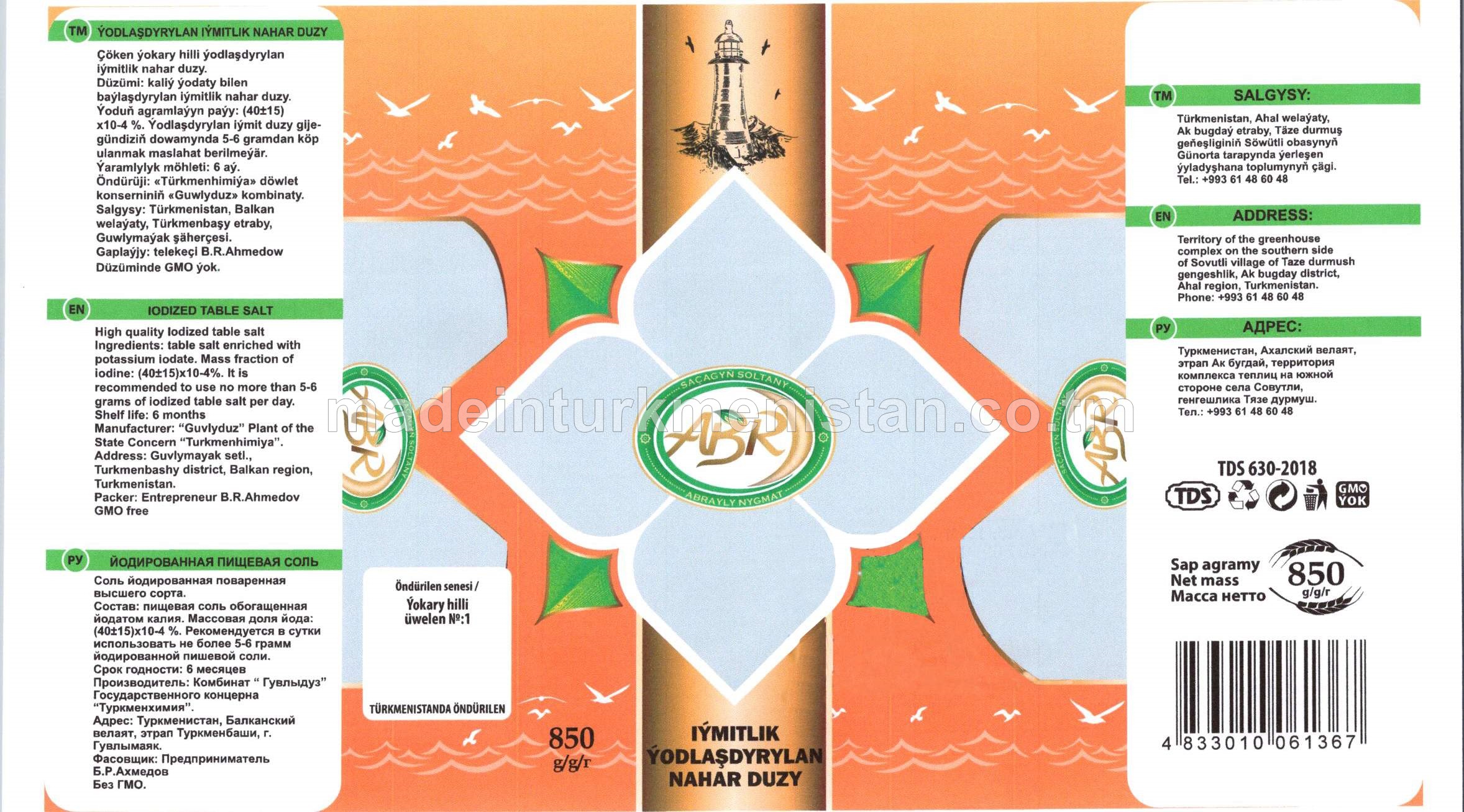 Ýodlaşdyrylan iýmitlik nahar duzy, üweme № 1 (Türkmenistanda öndürilen)