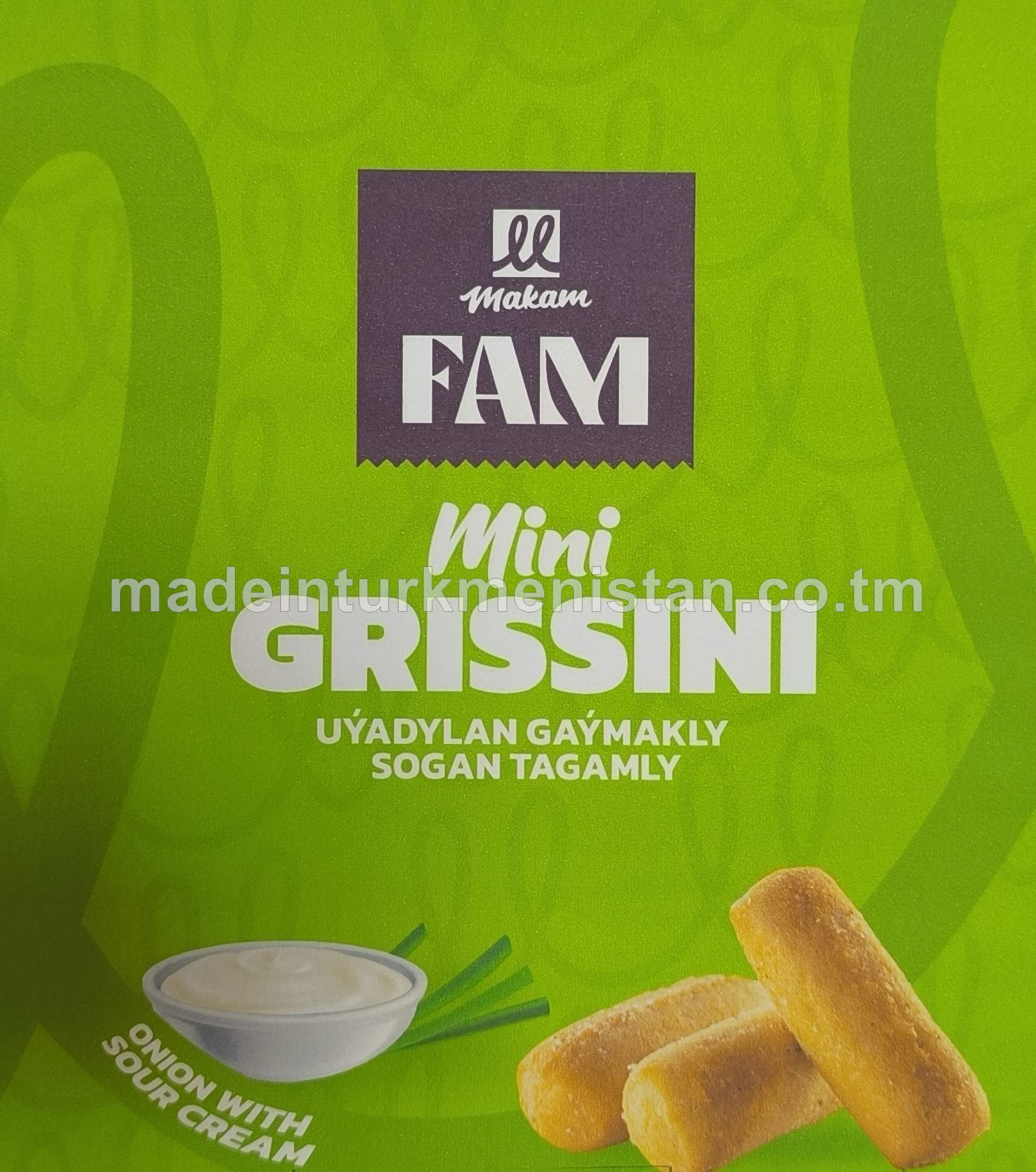"Fam" uýadylan gaýmakly sogan tagamly mini grissini çörek-bulka snekleri, ýoakry hilli bugdaý unundan (30 g x 80 sany)