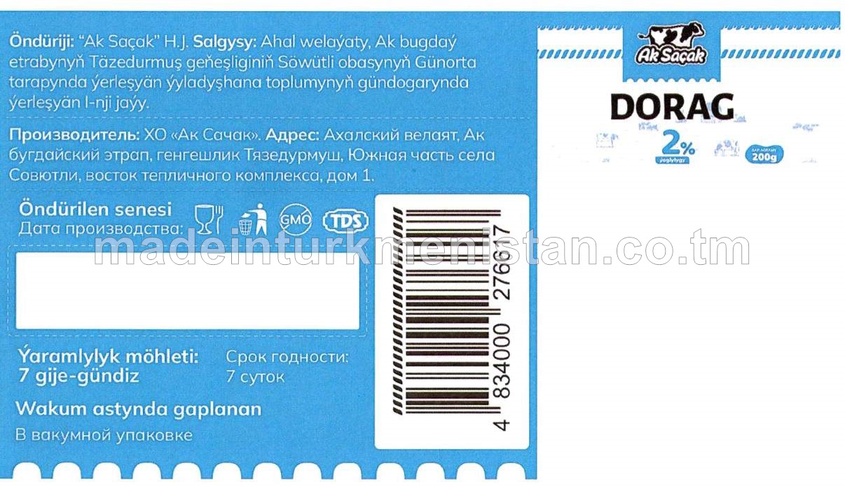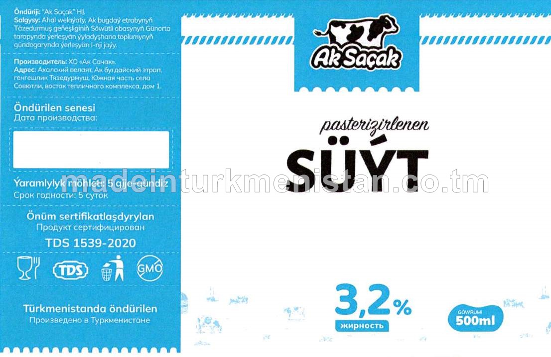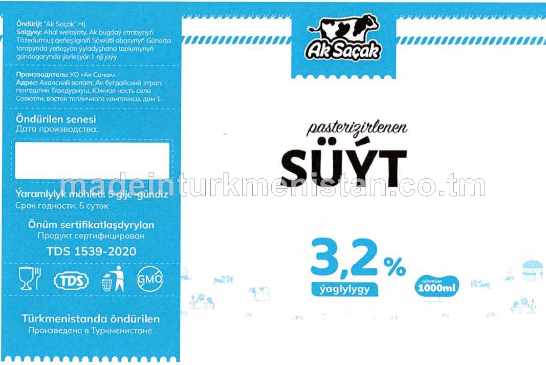 Pasterizirlenen süýt. Ýaglygy 3.2%