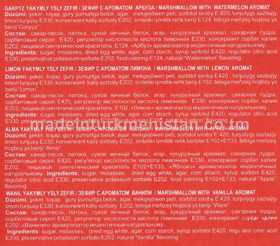 Dürli ýakymly ysly zefirler toplumy (garpyz, limon, alma, wanil, şokolad örtükli)