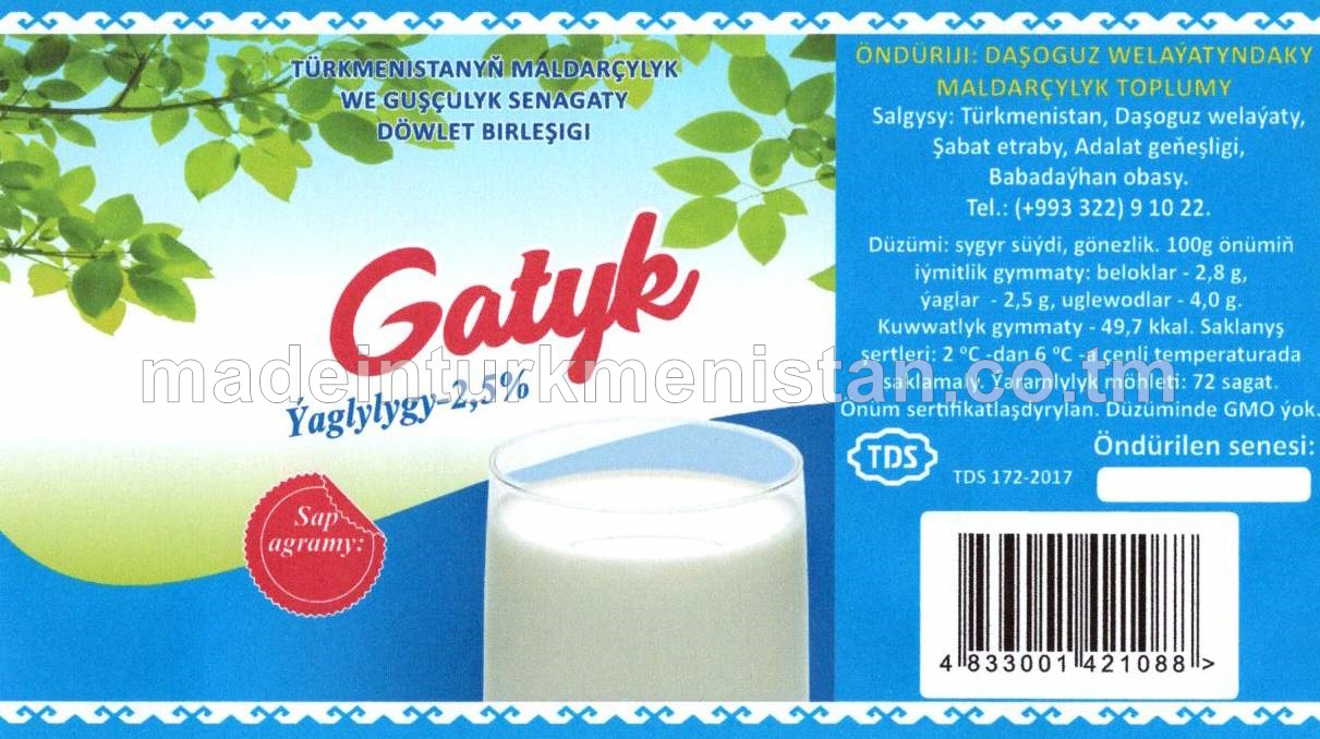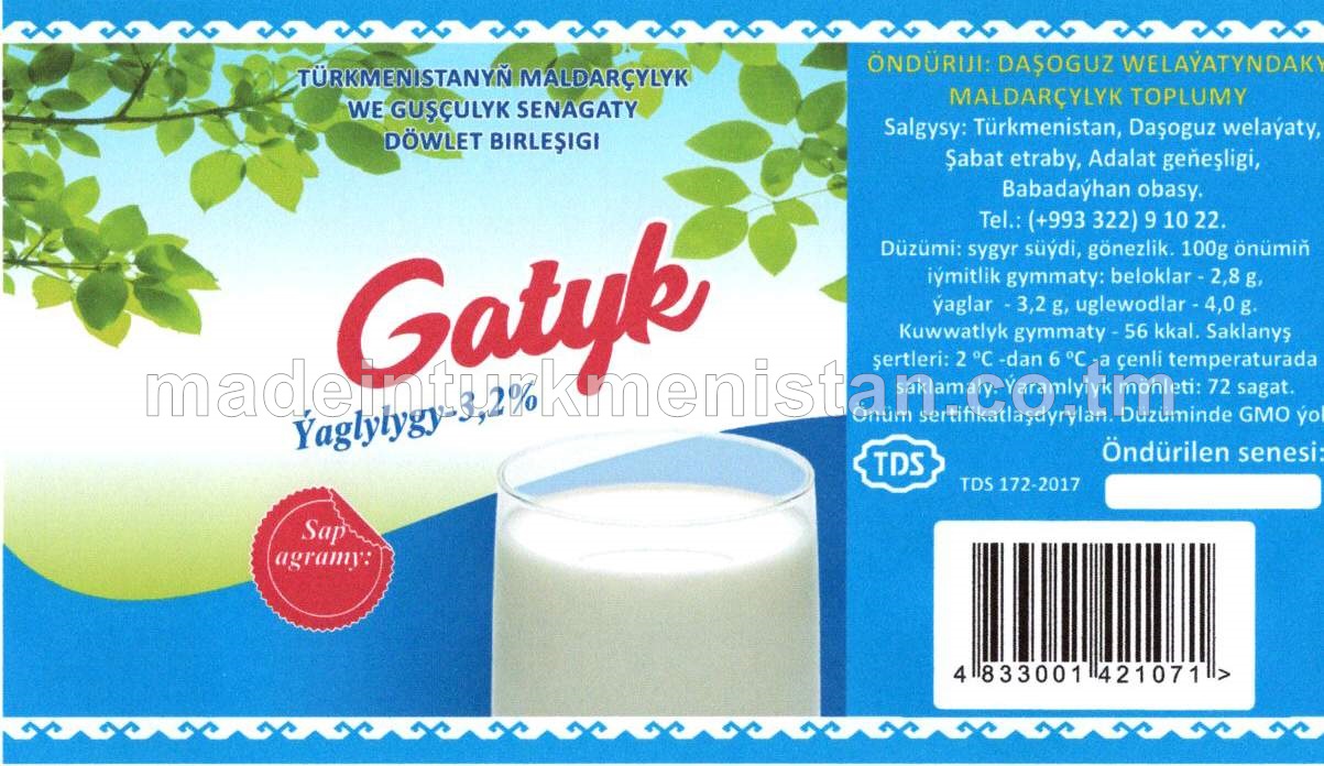 Pasterizirlenen sygyr süýdi, ýaglylygy 3,2%