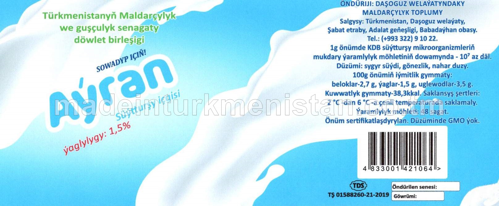"Aýran" süýtturşy içgisi, ýaglylygy 1,5%