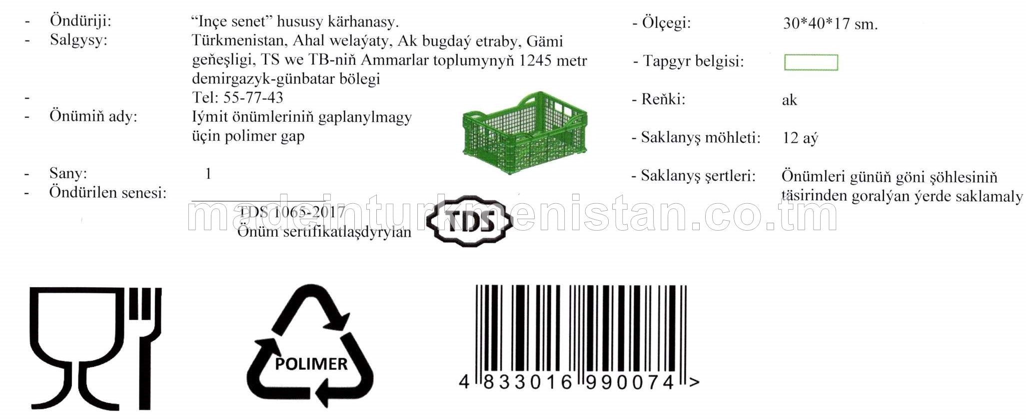 Iýmit önümleriniň gaplanylmagy üçin polimer gap (ölçegi: 30*40*17 sm., reňki: ak)