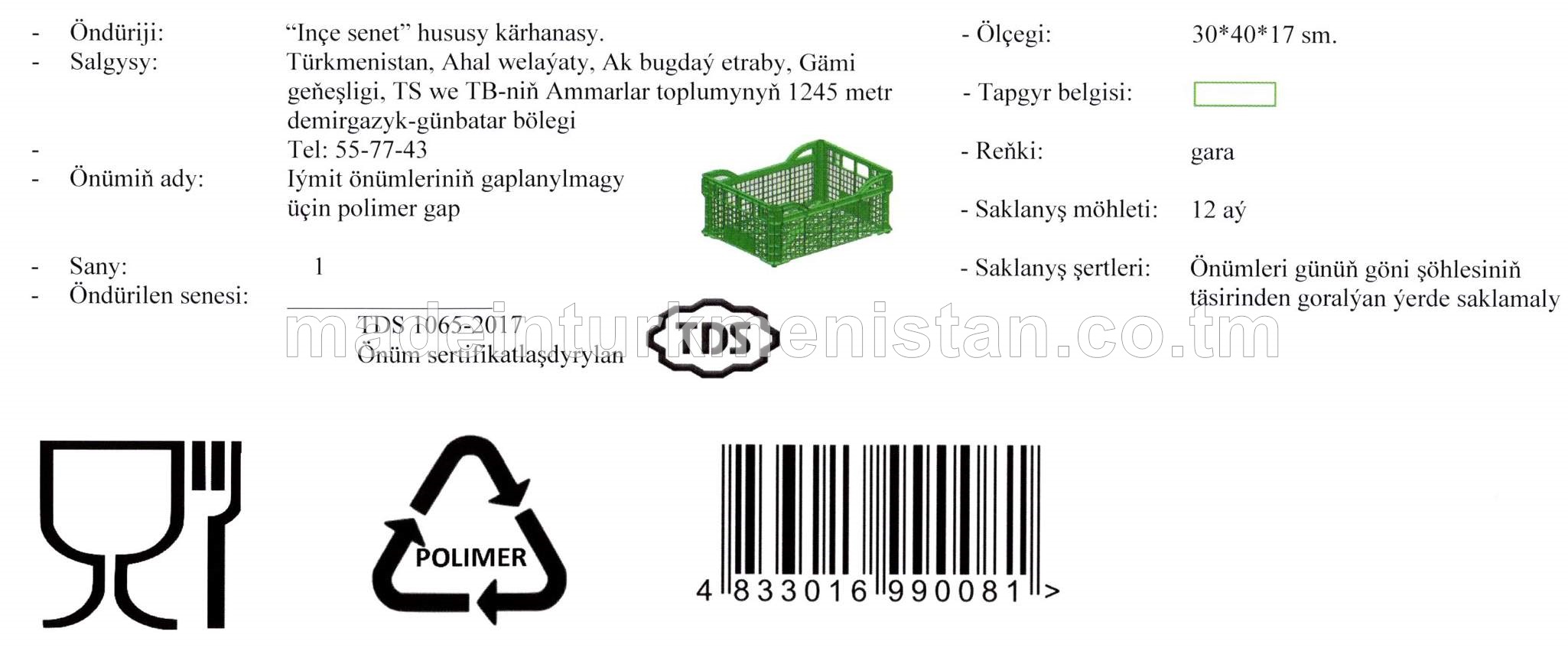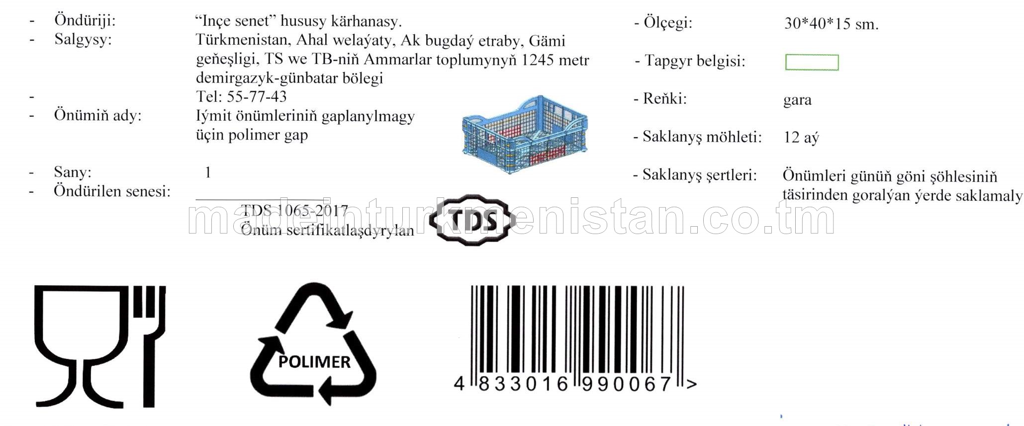 Iýmit önümleriniň gaplanylmagy üçin polimer gap (ölçegi: 30*40*15 sm., reňki: gara)