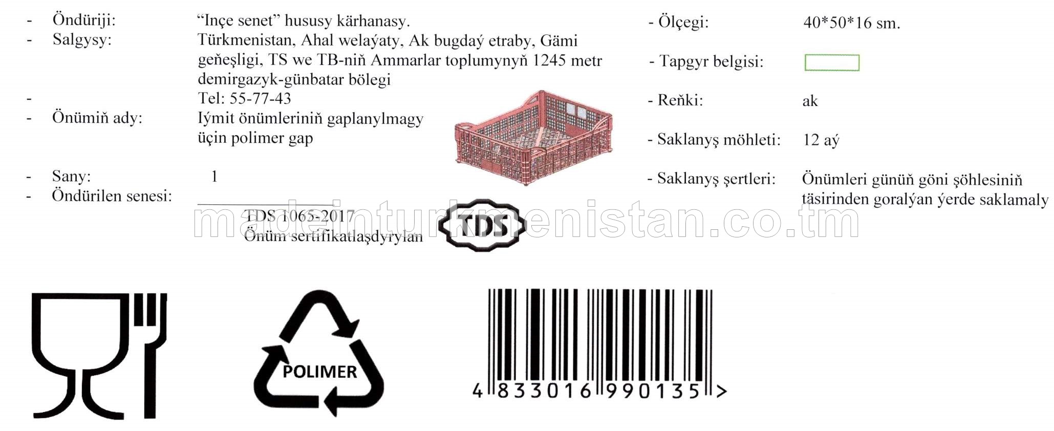 Iýmit önümleriniň gaplanylmagy üçin polimer gap (ölçegi: 40*50*16 sm., reňki: ak)