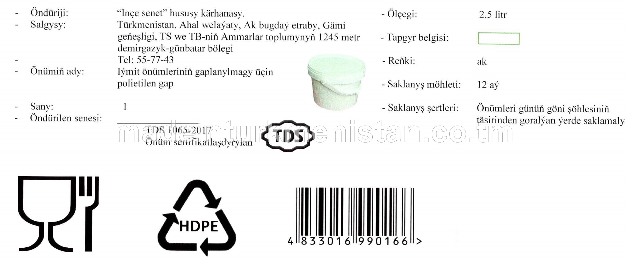 Iýmit önümleriniň gaplanylmagy üçin polietilen gap (ölçegi: 2.5 litr., reňki: ak, HDPE)