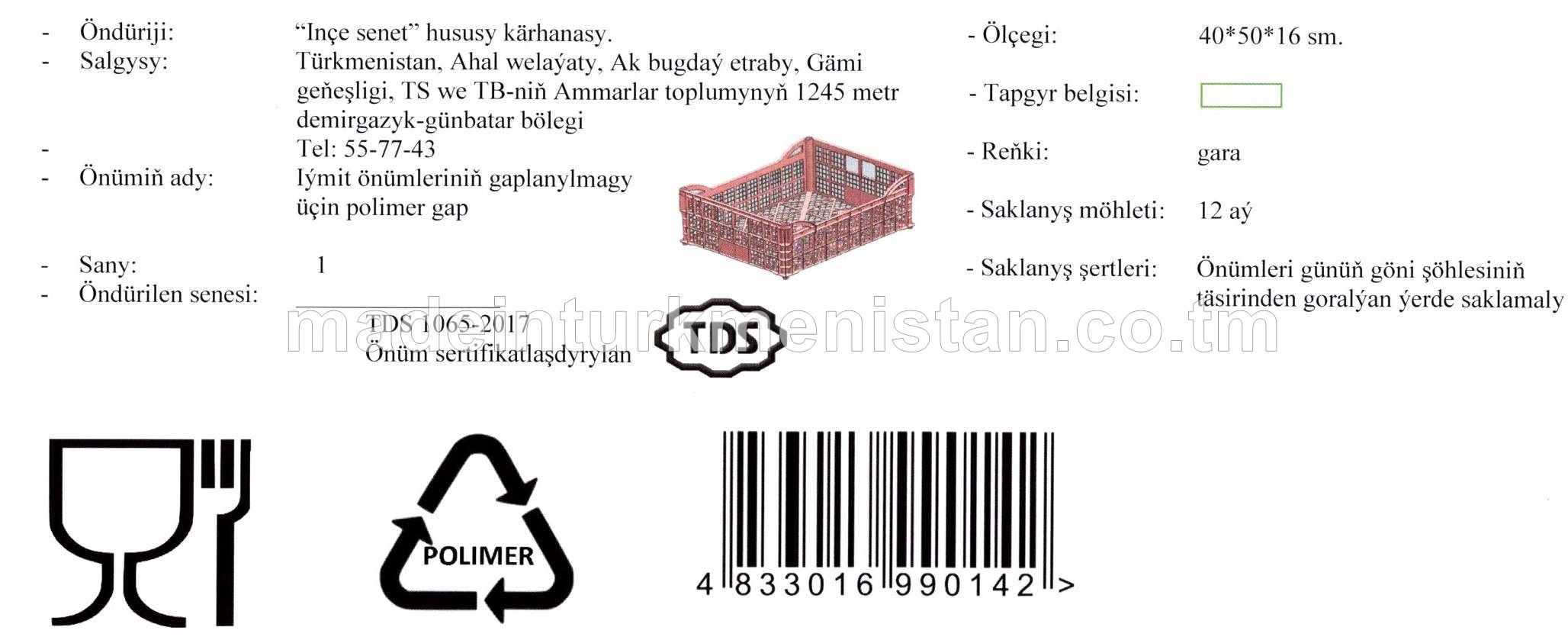 Iýmit önümleriniň gaplanylmagy üçin polimer gap (ölçegi: 40*50*16 sm., reňki: gara)