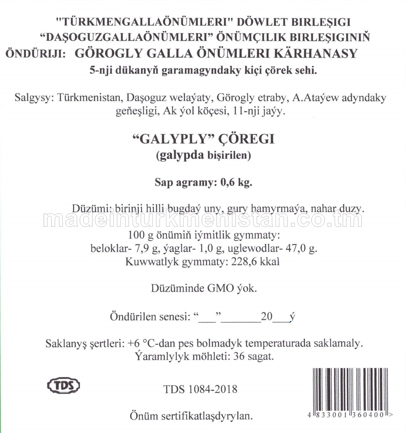 "Galyply" çöregi (galypda bişirilen). Birinji hilli bugdaý unundan (5-nji dükanyň garamagyndaky kiçi çörek sehi)