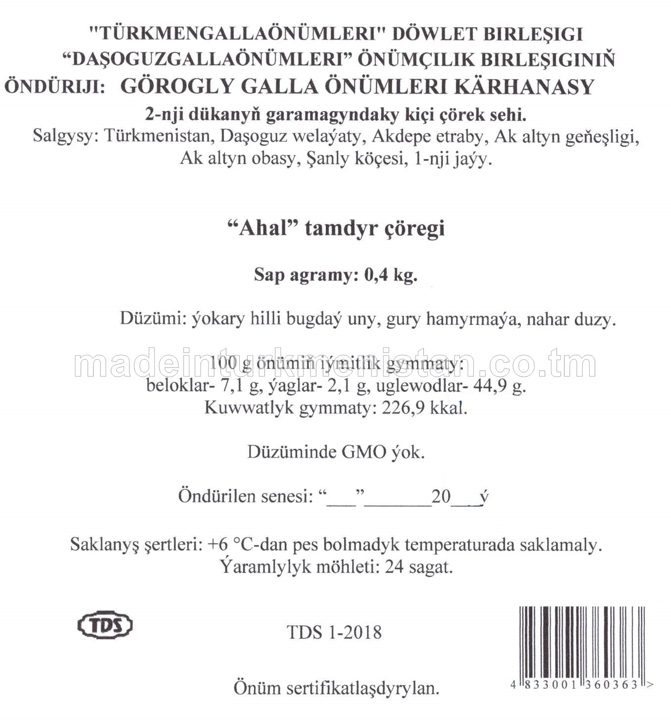 "Ahal" tamdyr çöregi. Ýokary hilli bugdaý unundan (5-nji dükanyň garamagyndaky kiçi çörek sehi)