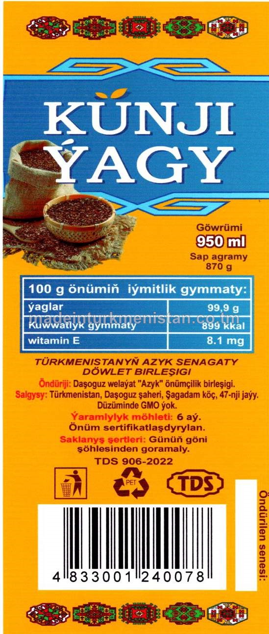 Arassalanan pagta ýagy. Dezodorirlenmedik. Birinji hilli