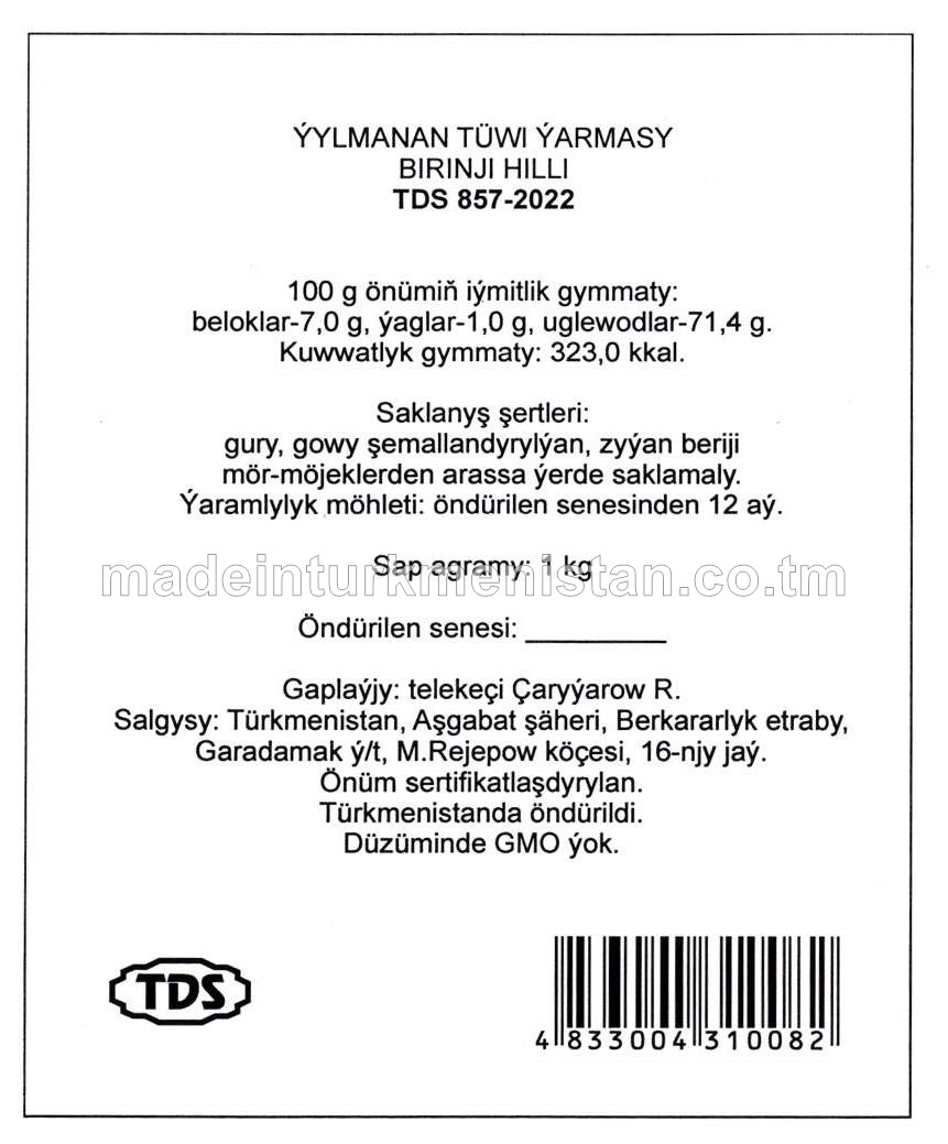 Ýylmanan tüwi ýarmasy birinji hilli (Türkmenistanyň önümi)