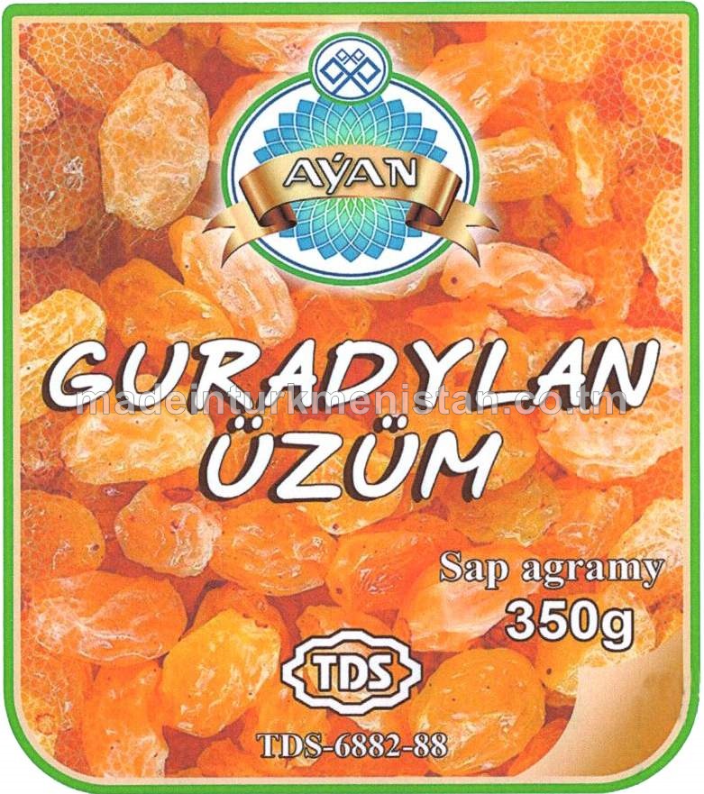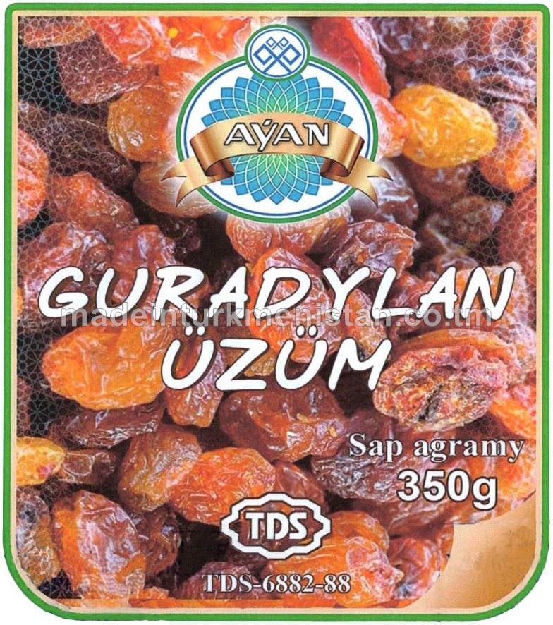 Guradylan üzüm. Altyn öwüşginli açyk reňkli. Ýokary hilli