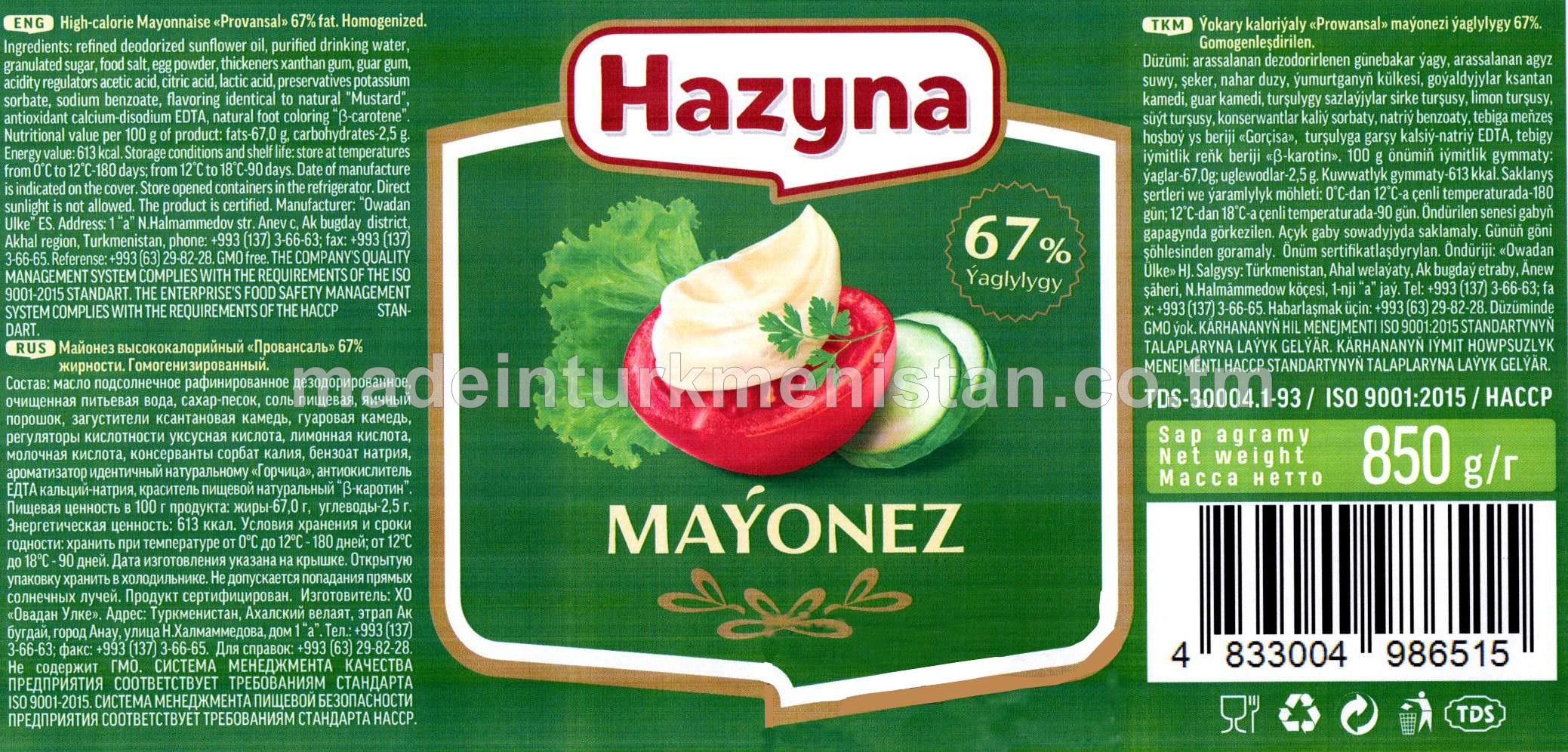 Pes kaloriýaly "Hazyna" maýonezi ýaglygy 40%. Gomogenleşdirilen