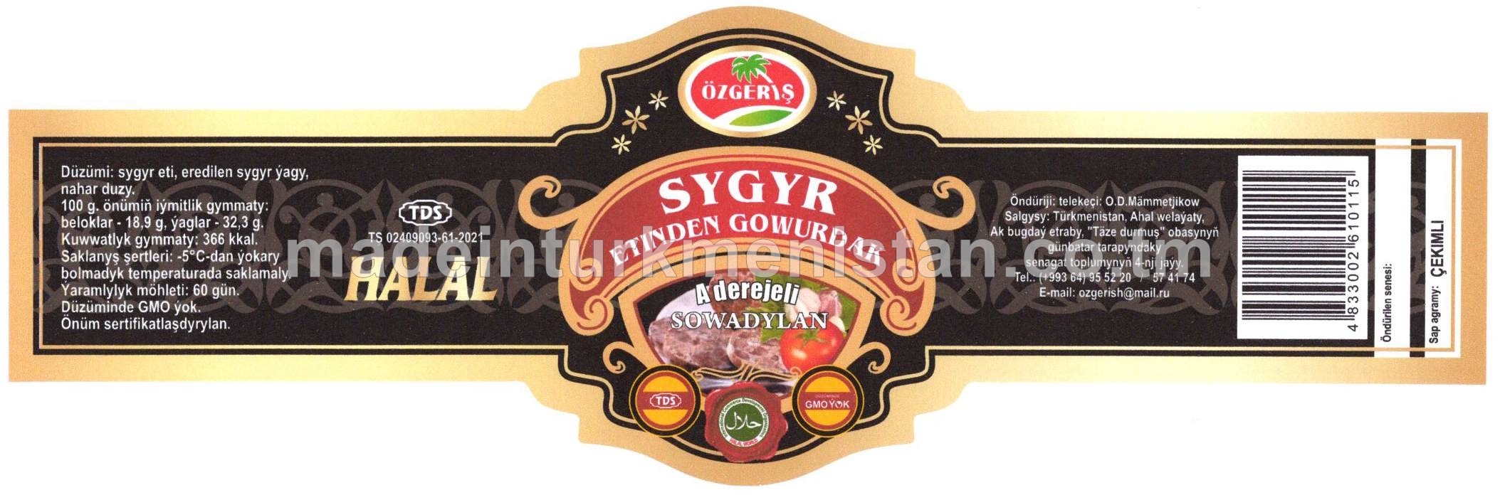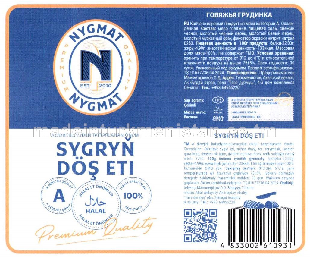 "Sygryň döş eti" A derejeli kakadylan-gaýnadylan etden taýýarlanýan önüm. Sowadylan (çekimli)