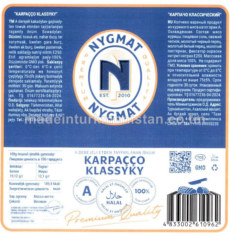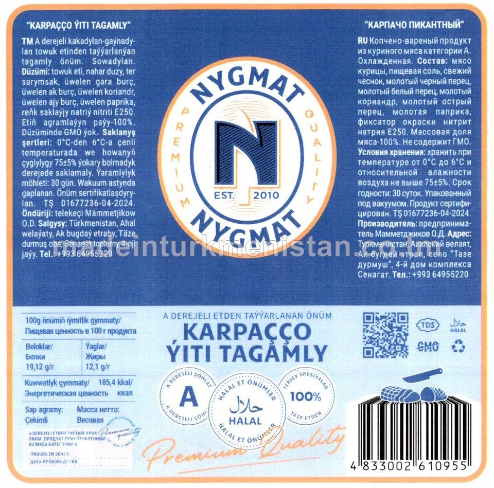 "Karpaço ýiti tagamly" A derejeli kakadylan-gaýnadylan towuk etinden taýýarlanýan tagamly önüm (çekimli)