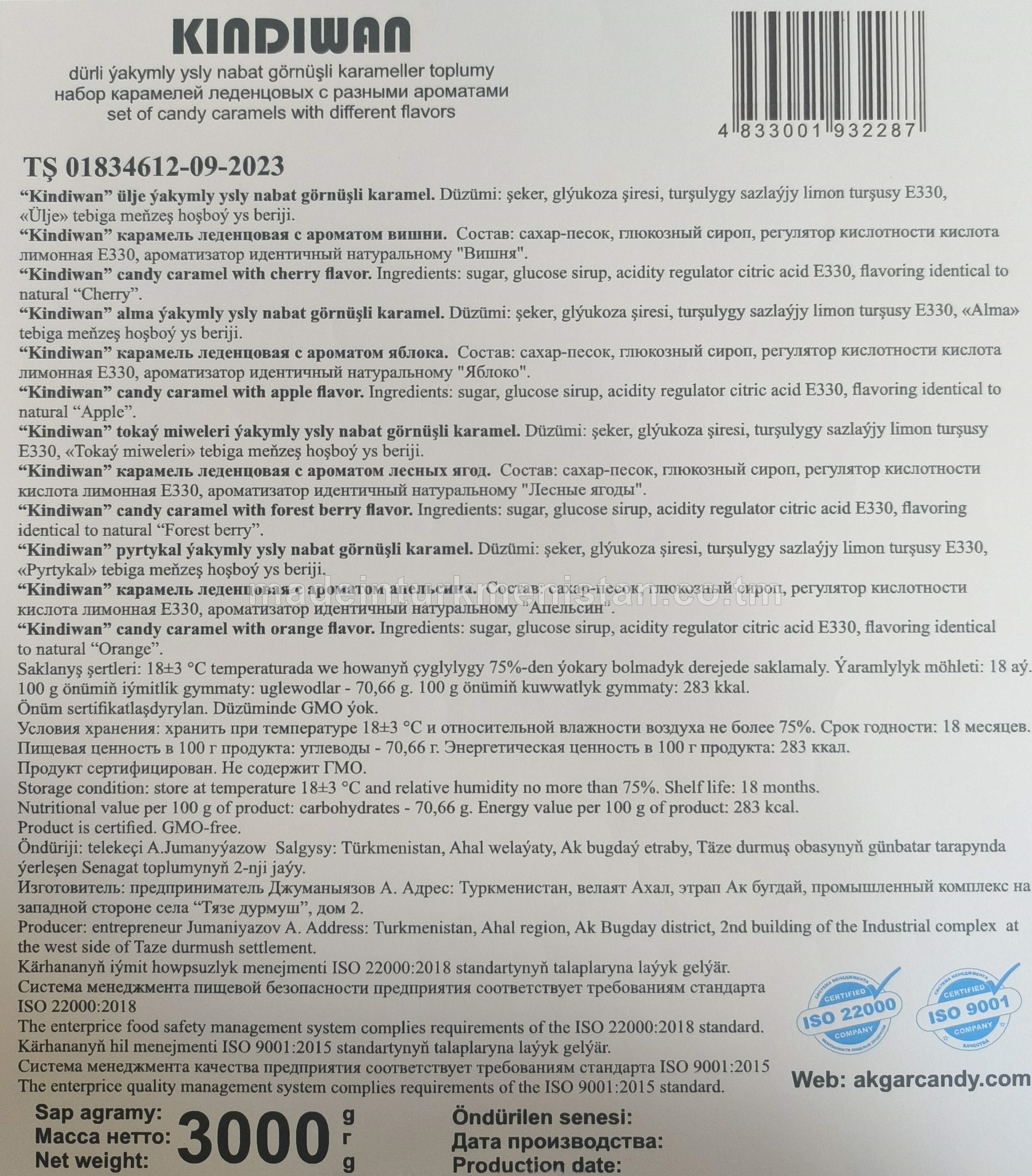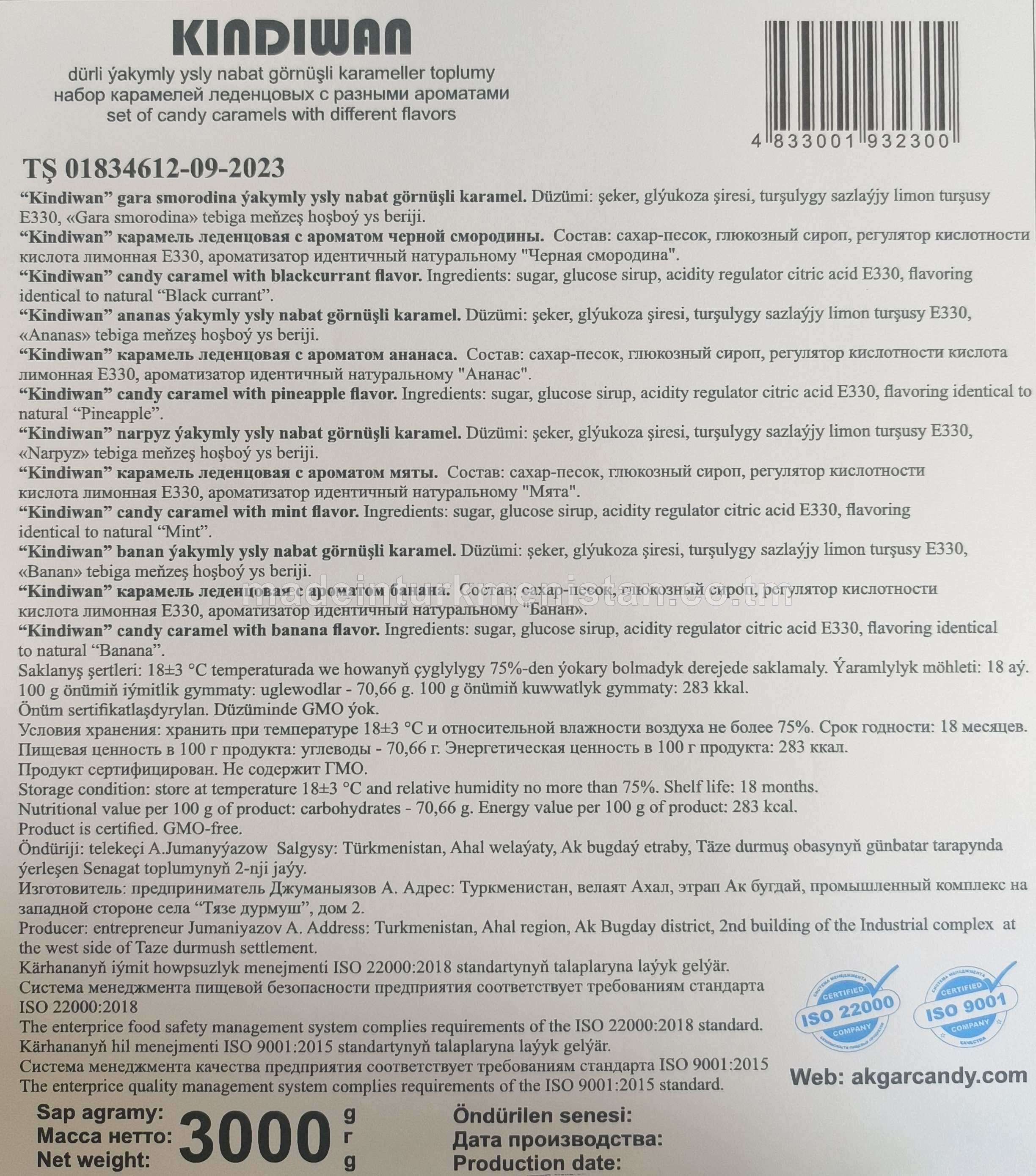 "Kindiwan" dürli ýakymly ysly nabat görnüşli karameller toplumy (ülje, alma, tokaý miweleri, pyrtykal)