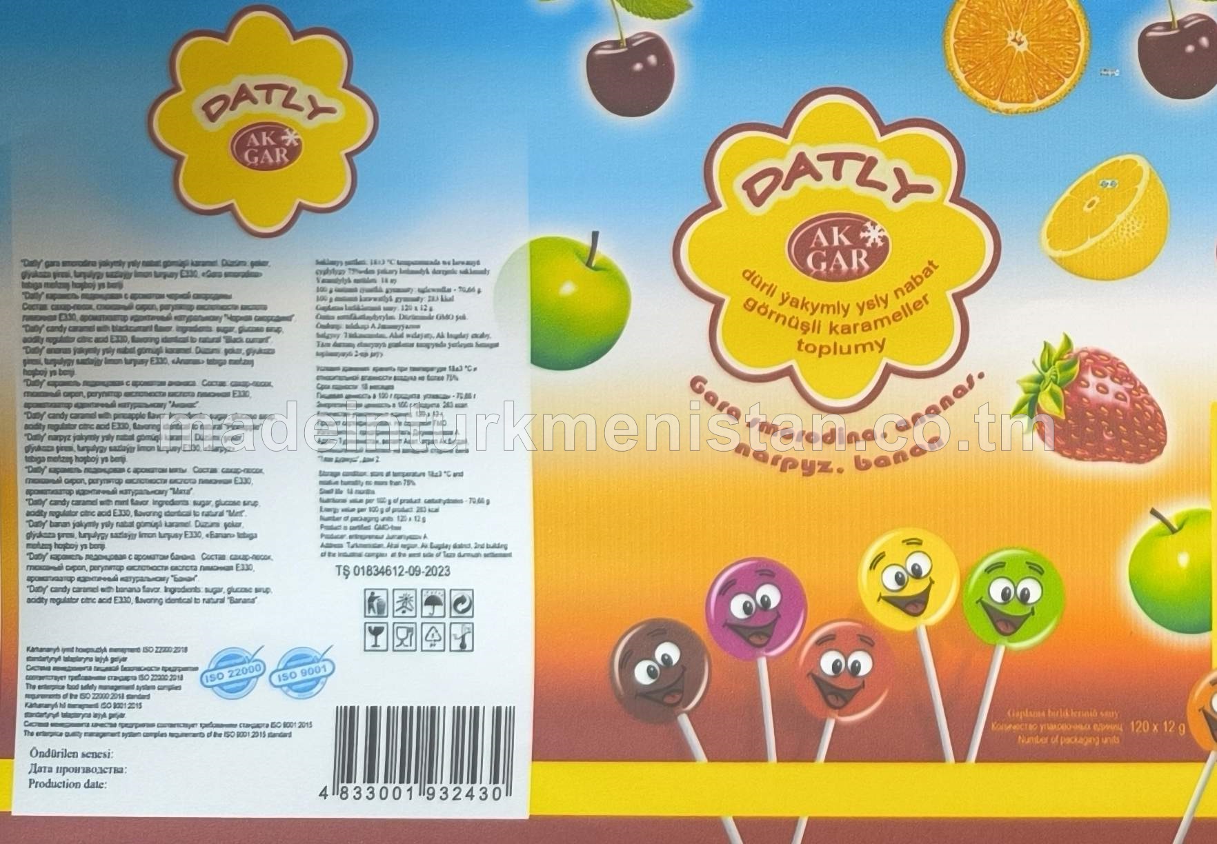 "Datly" dürli ýakymly ysly nabat görnüşli karameller toplumy (ülje, alma, tokaý miweleri, pyrtykal) 12g*120 sany