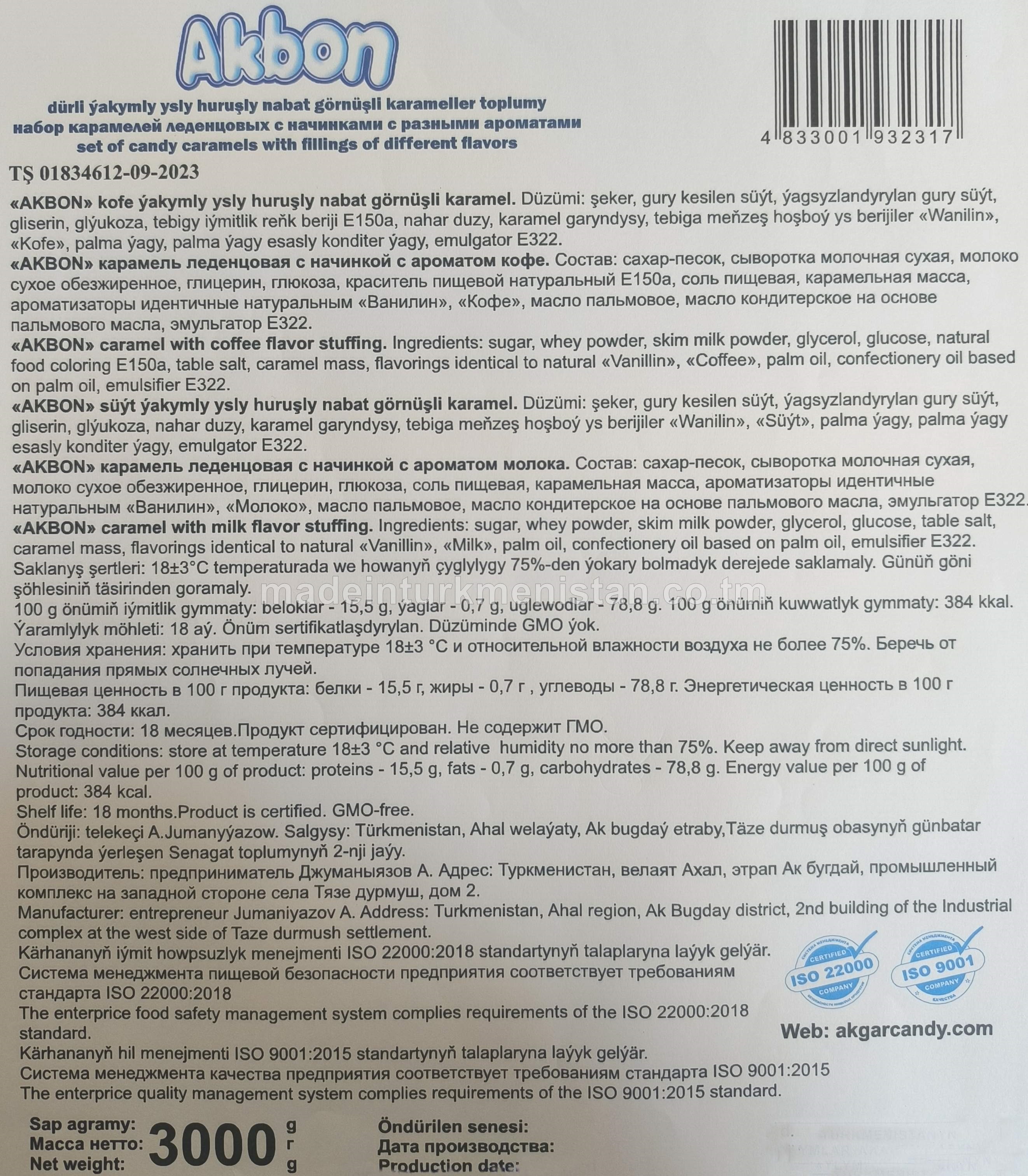 "Akbon" dürli ýakymly ysly huruşly nabat görnüşli karameller toplumy (kofe, süýt)