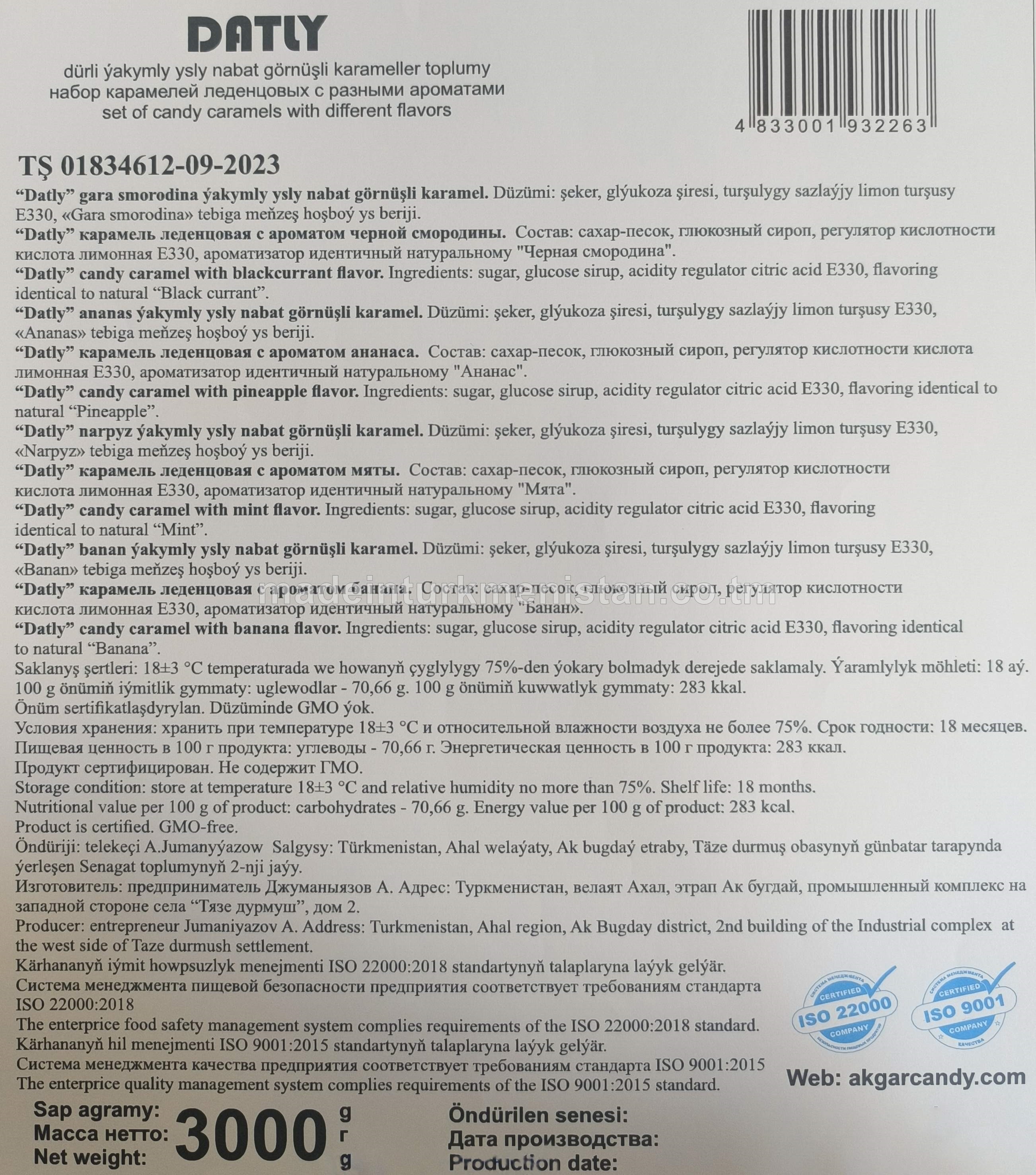 "Datly" dürli ýakymly ysly nabat görnüşli karameller toplumy (gara smorodina, ananas, narpyz, banan)