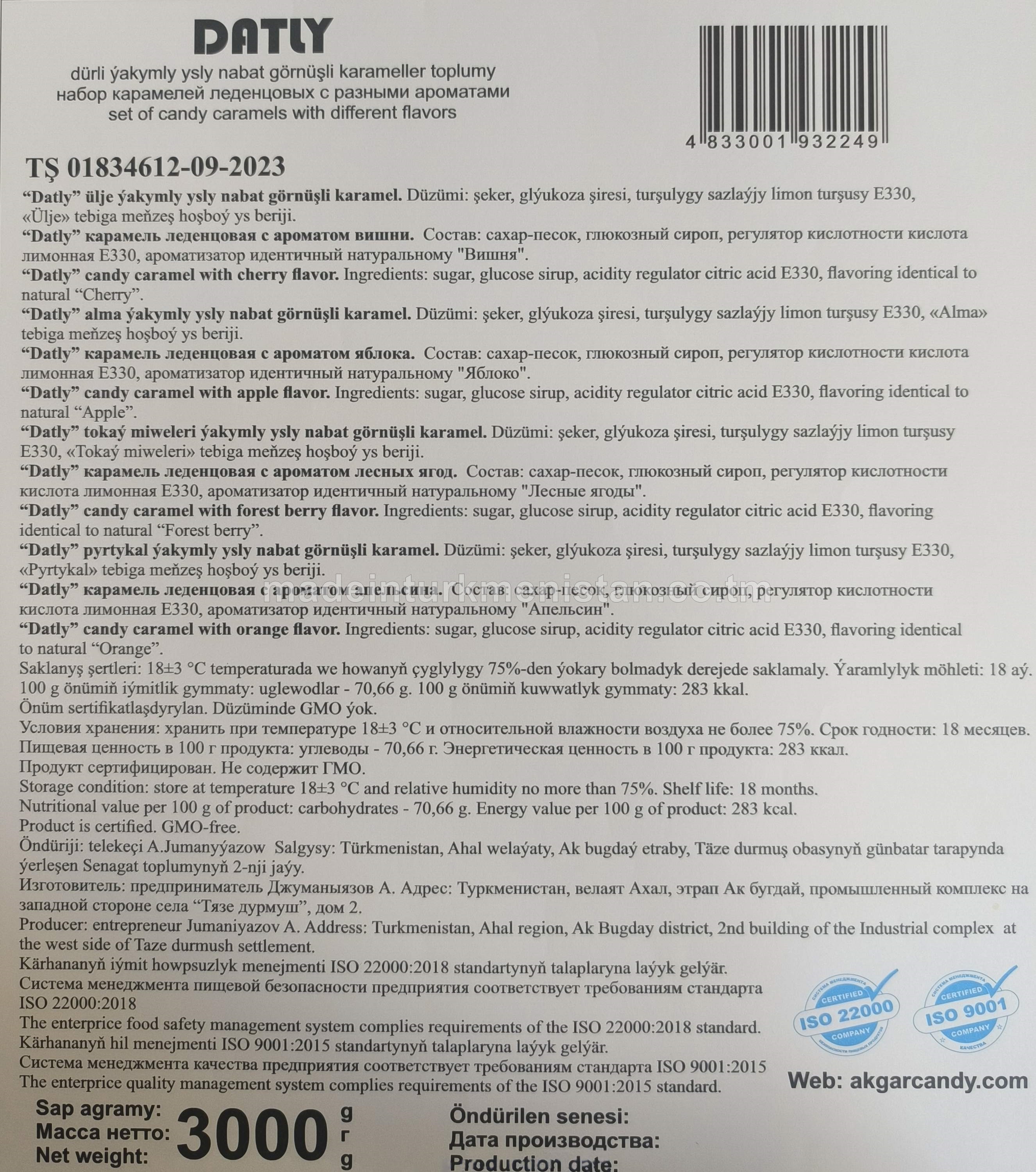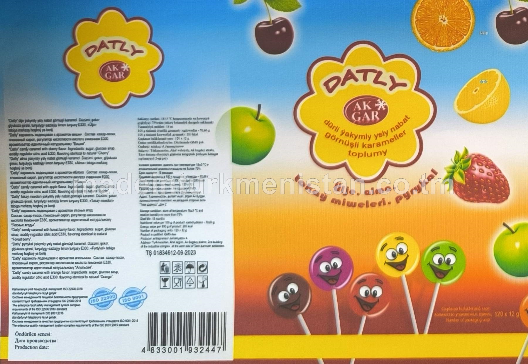 "Datly" dürli ýakymly ysly nabat görnüşli karameller toplumy (ülje, alma, tokaý miweleri, pyrtykal)