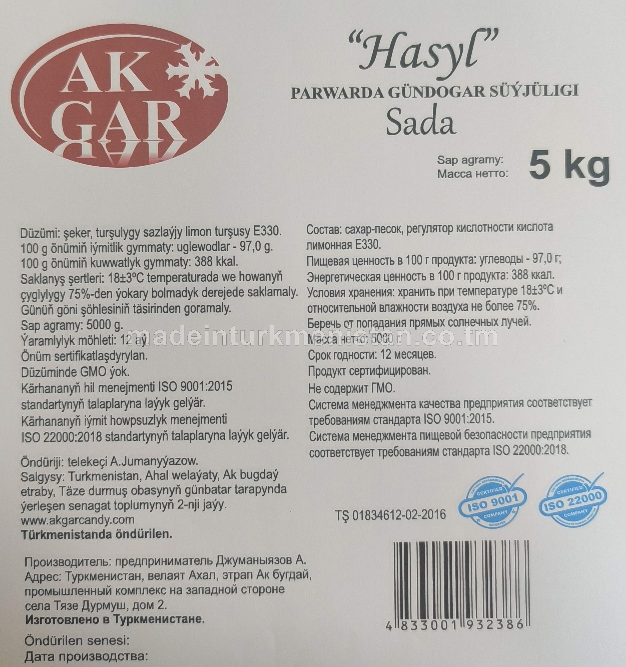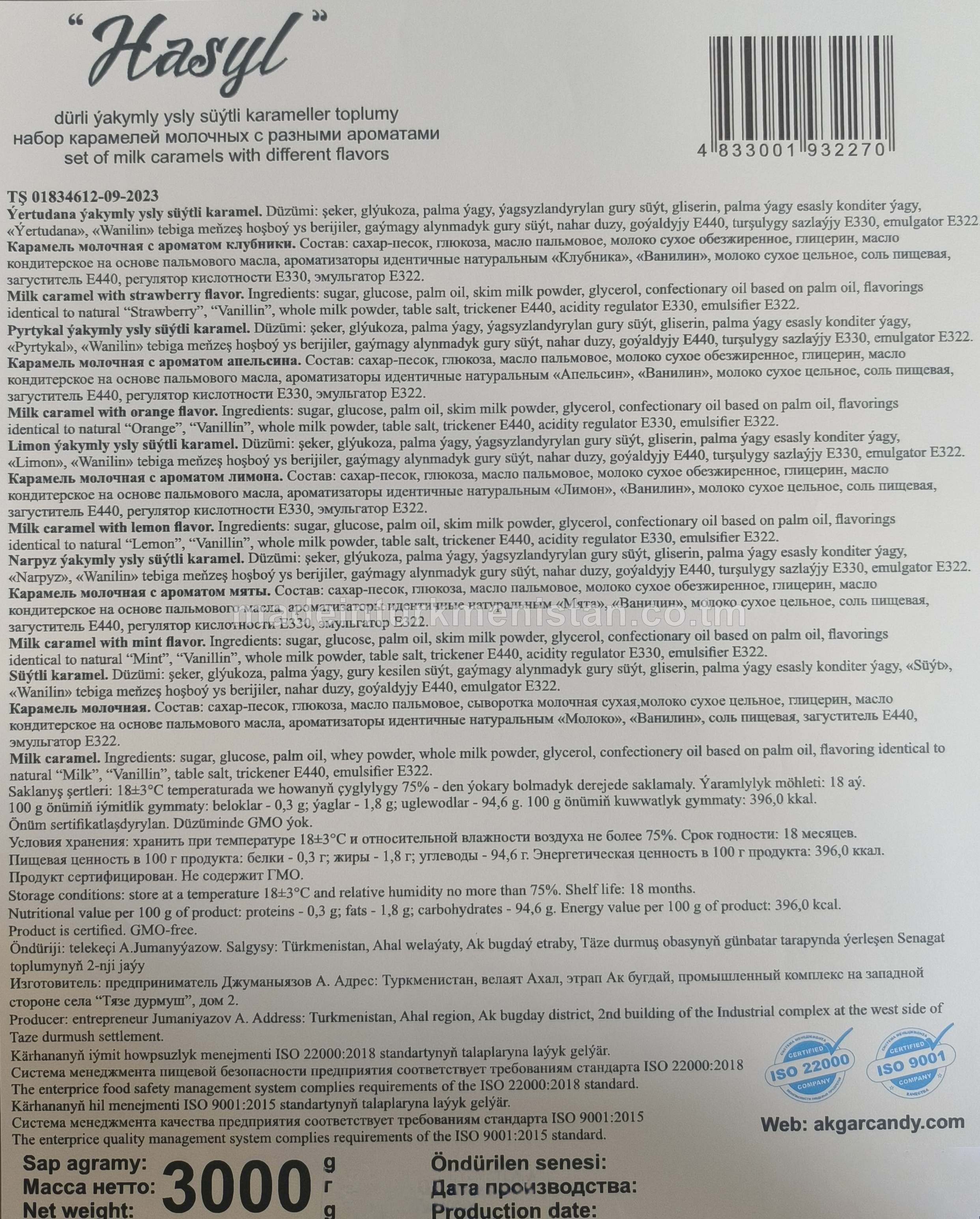 "Hasyl" dürli ýakymly ysly süýtli karameller toplumy (ýertudana, pyrtykal, limon, narpyz, süýt)