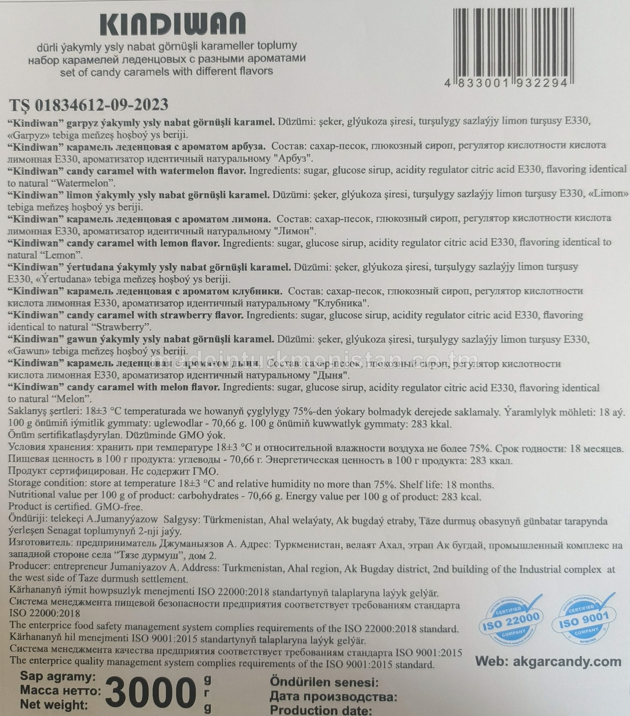 "Kindiwan" dürli ýakymly ysly nabat görnüşli karameller toplumy (garpyz, limon, ýertudana, gawun)