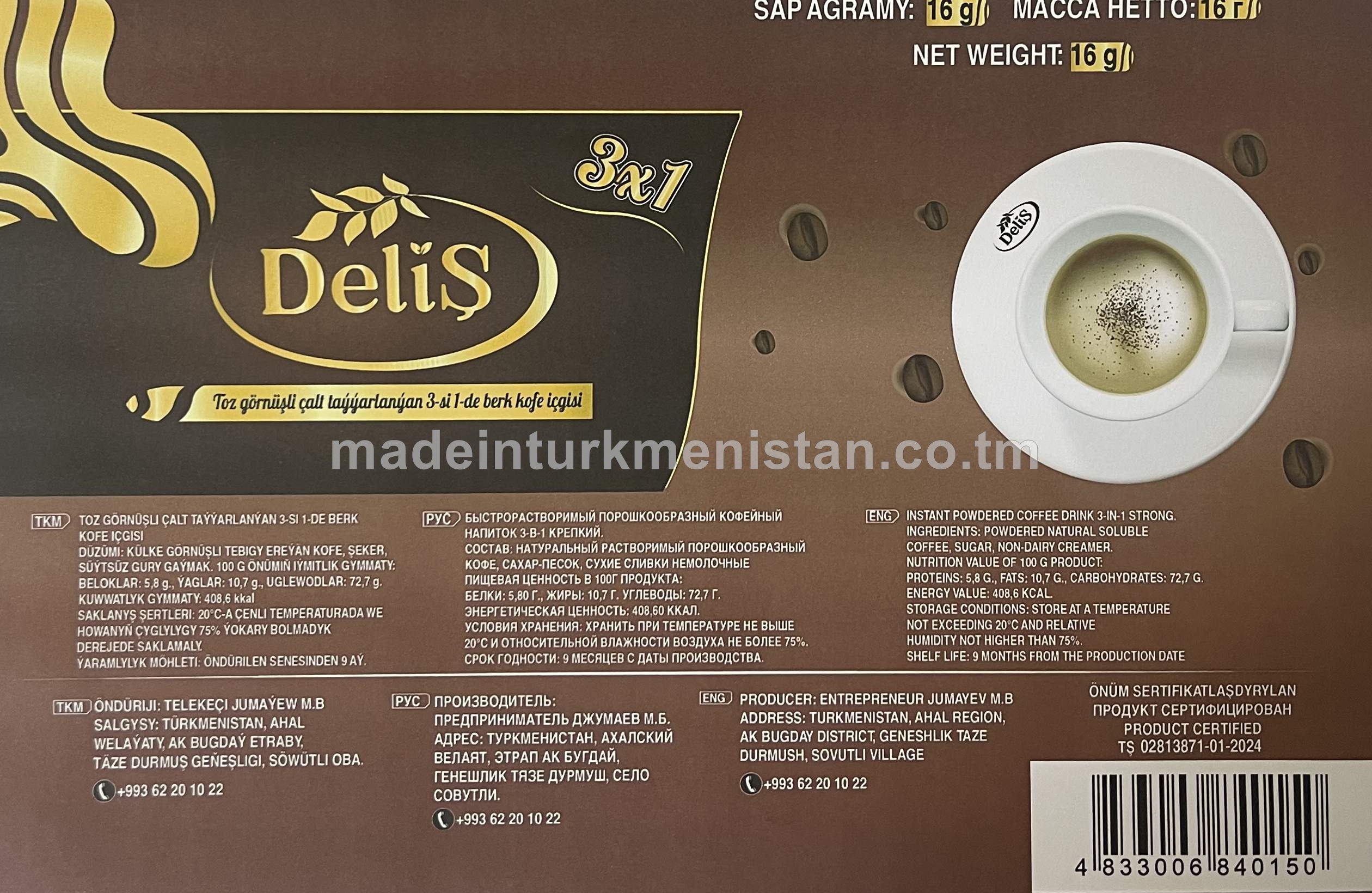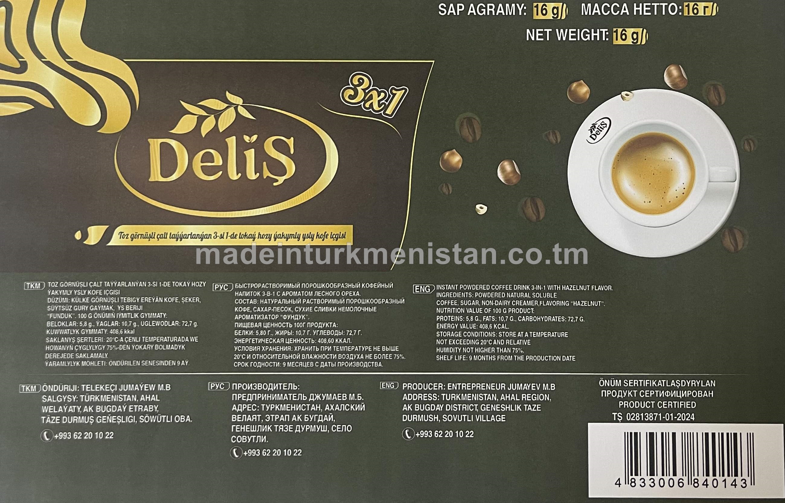 Toz görnüşi çalt taýýarlanylýan 3-si 1-de berk kofe içgisi(16g*30sany)