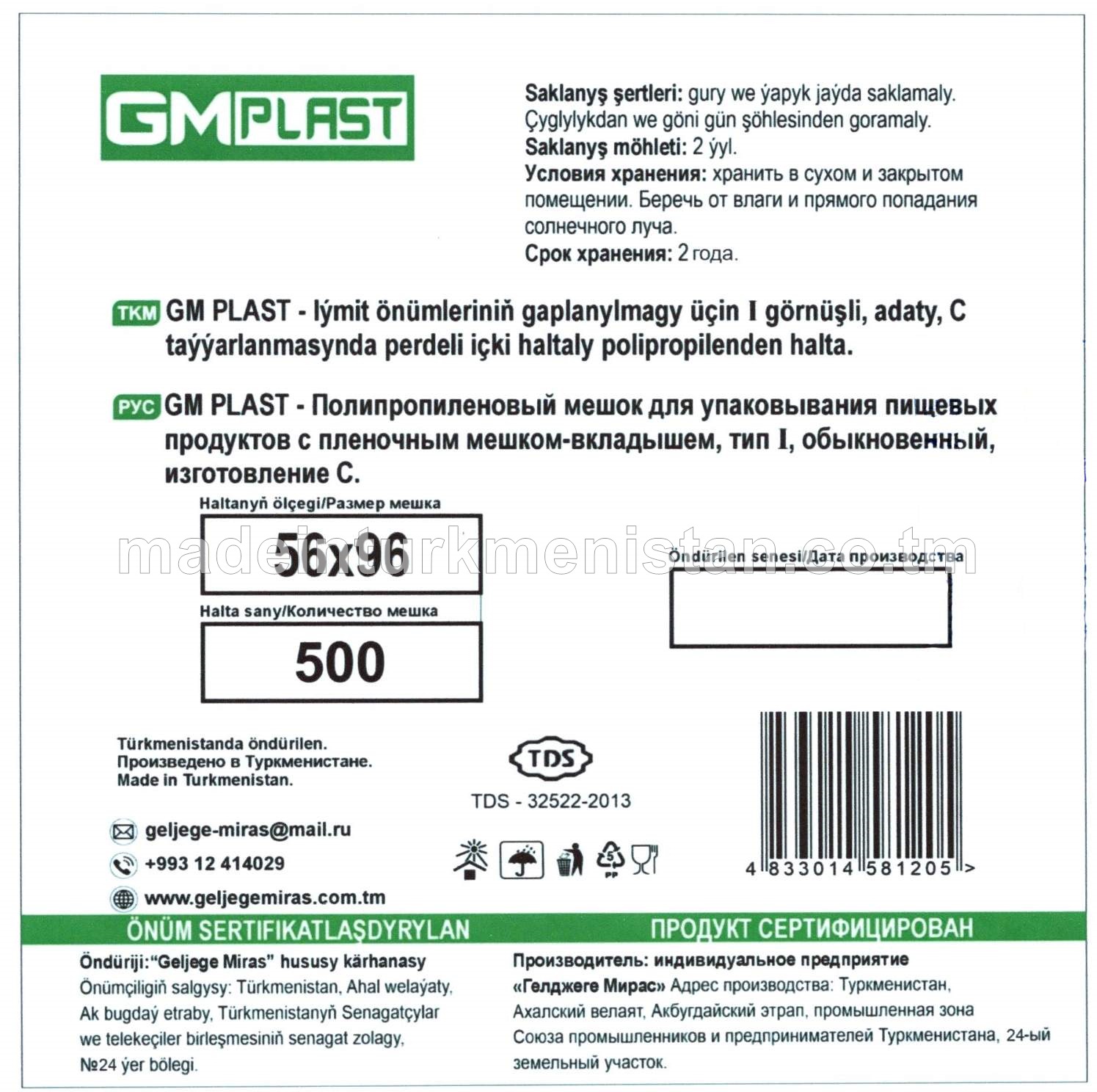 Iýmit önümleriniň gaplanylmagy üçin I görnüşli, adaty, C taýýarlanmasynda perdeli içki haltaly polipropilen halta. ölçegi 56*96 sm