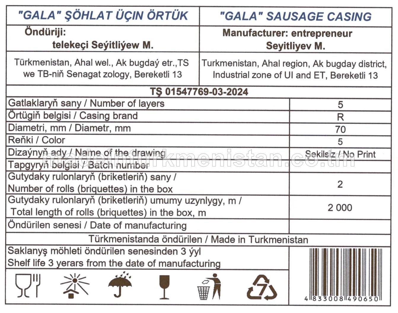 "Gala" şöhlat üçin örtük, gatlaklaryň sany 5, örtügiň belgisi R, diametri 70mm, reňki 5, dizaýnyň ady şekilsiz, gutydaky rulonlaryň sany 2