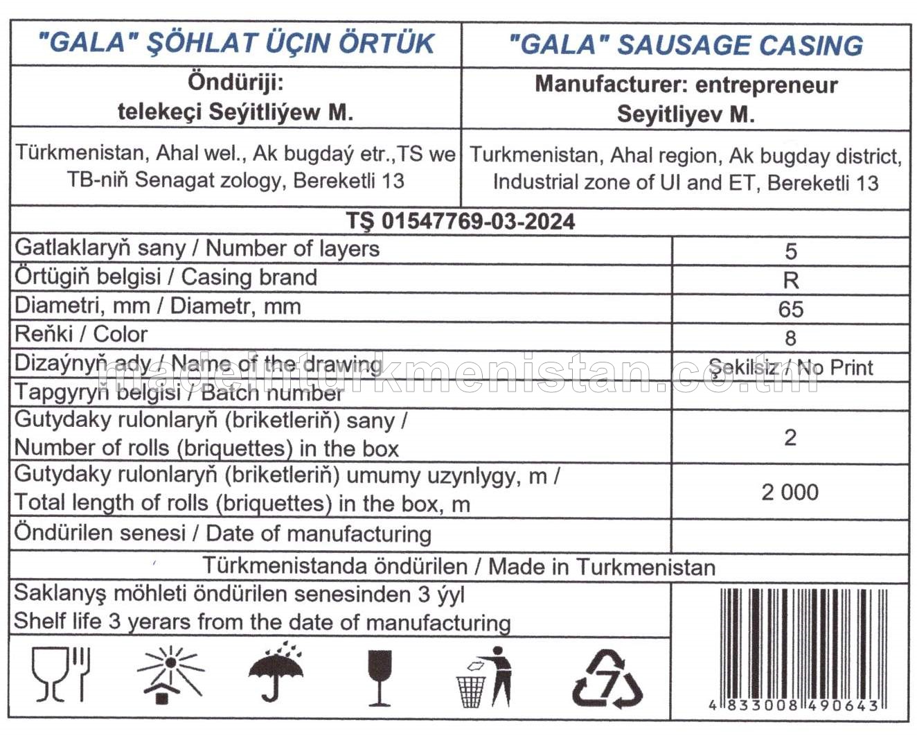 "Gala" şöhlat üçin örtük, gatlaklaryň sany 5, örtügiň belgisi R, diametri 65mm, reňki 8, dizaýnyň ady şekilsiz, gutydaky rulonlaryň sany: 2
