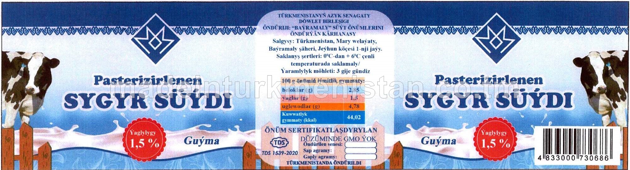 Pasterizirlenen sygyr süýdi. Ýaglygy 1,5%