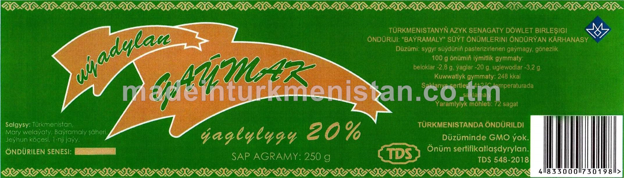 Şekerli gaýmagy alynmadyk goýaldylan süýt. Ýaglygy 8,5%