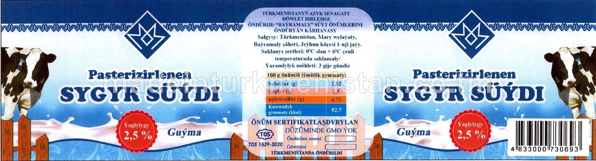 Pasterizirlenen sygyr süýdi. Ýaglygy 2,5%