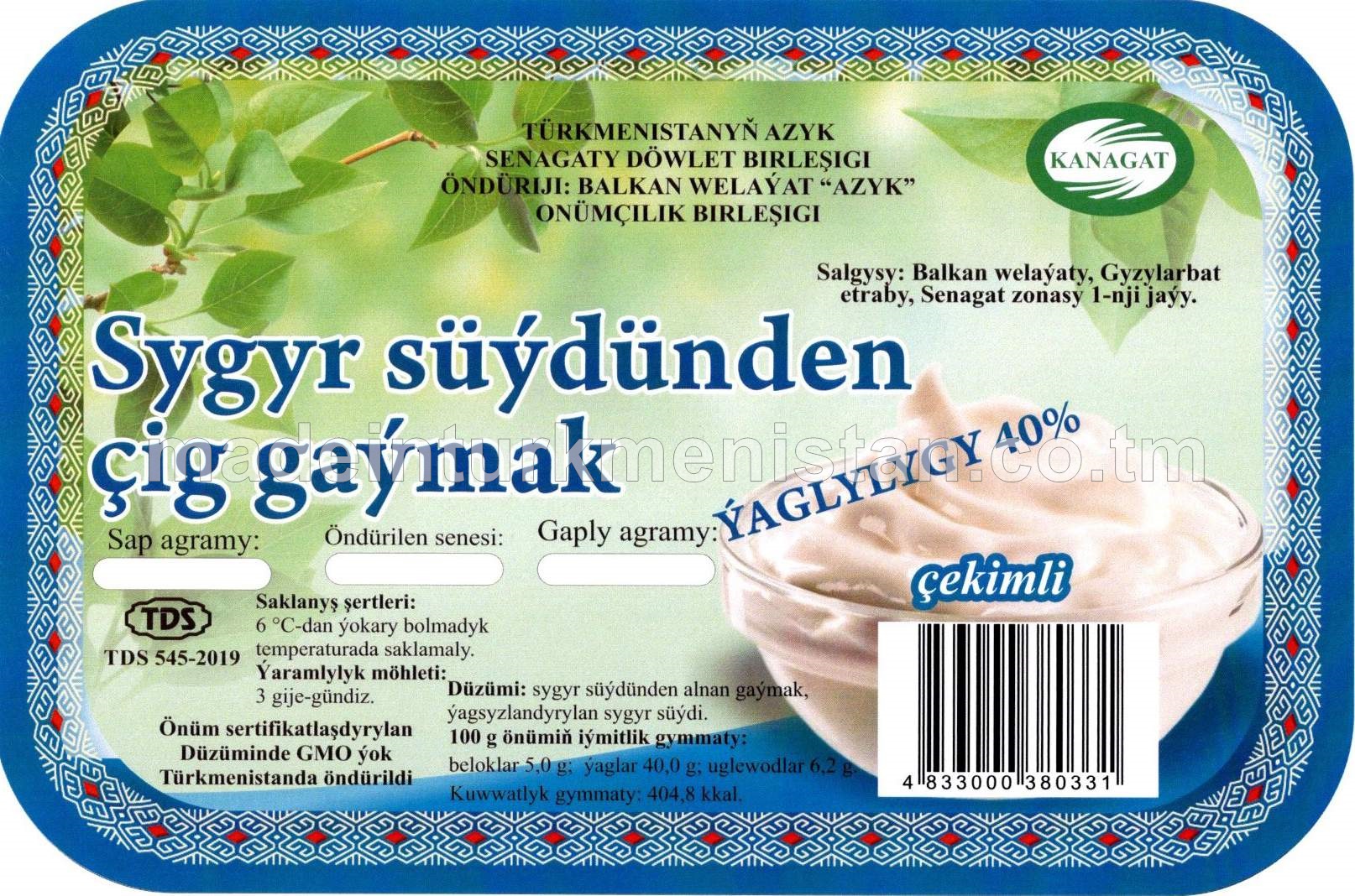 Sygyr süýdünden çig gaýmak. Ýaglylygy 40%