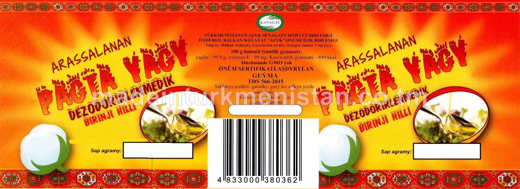 Arassalanan pagta ýagy. Dezodorirlenmedik. Birinji hilli
