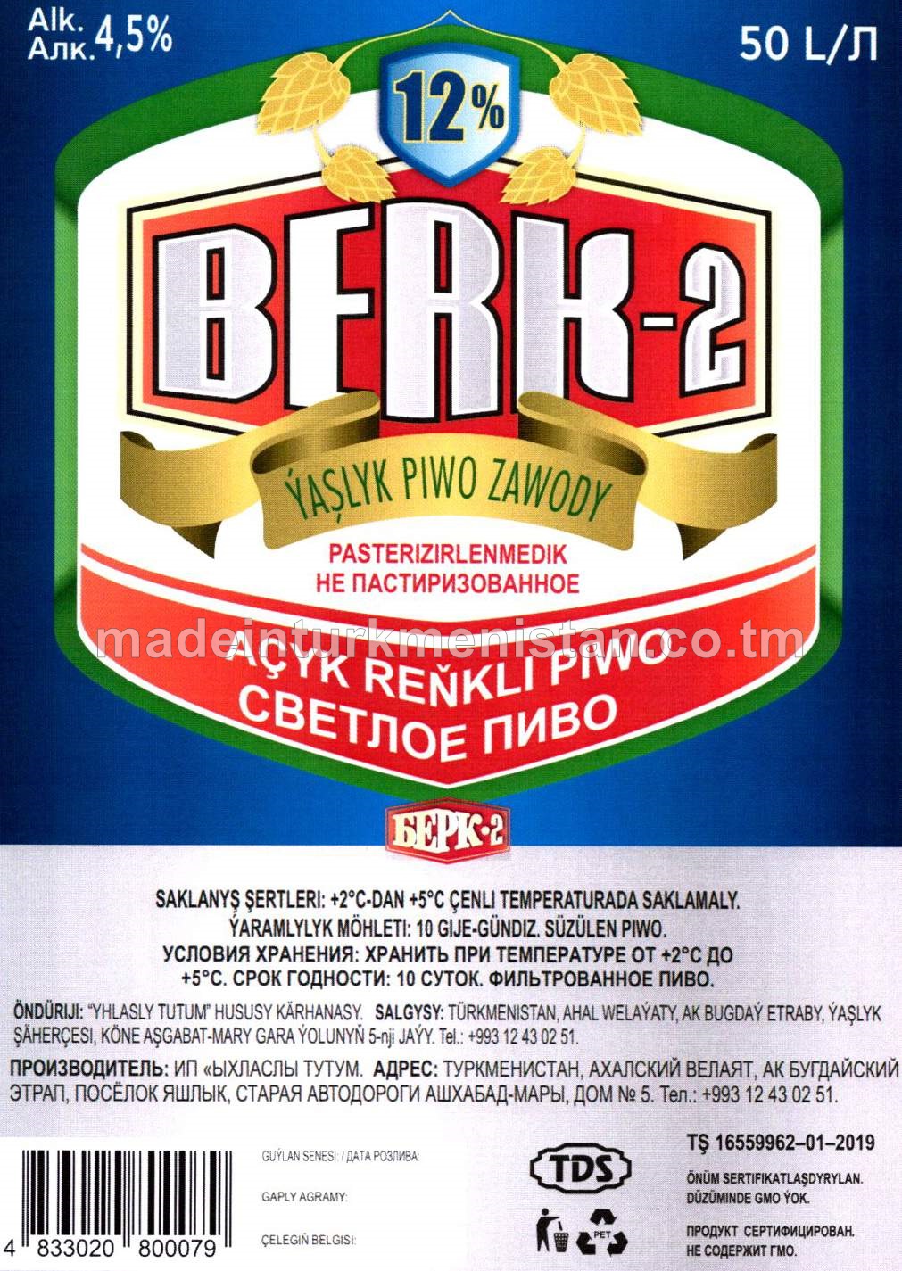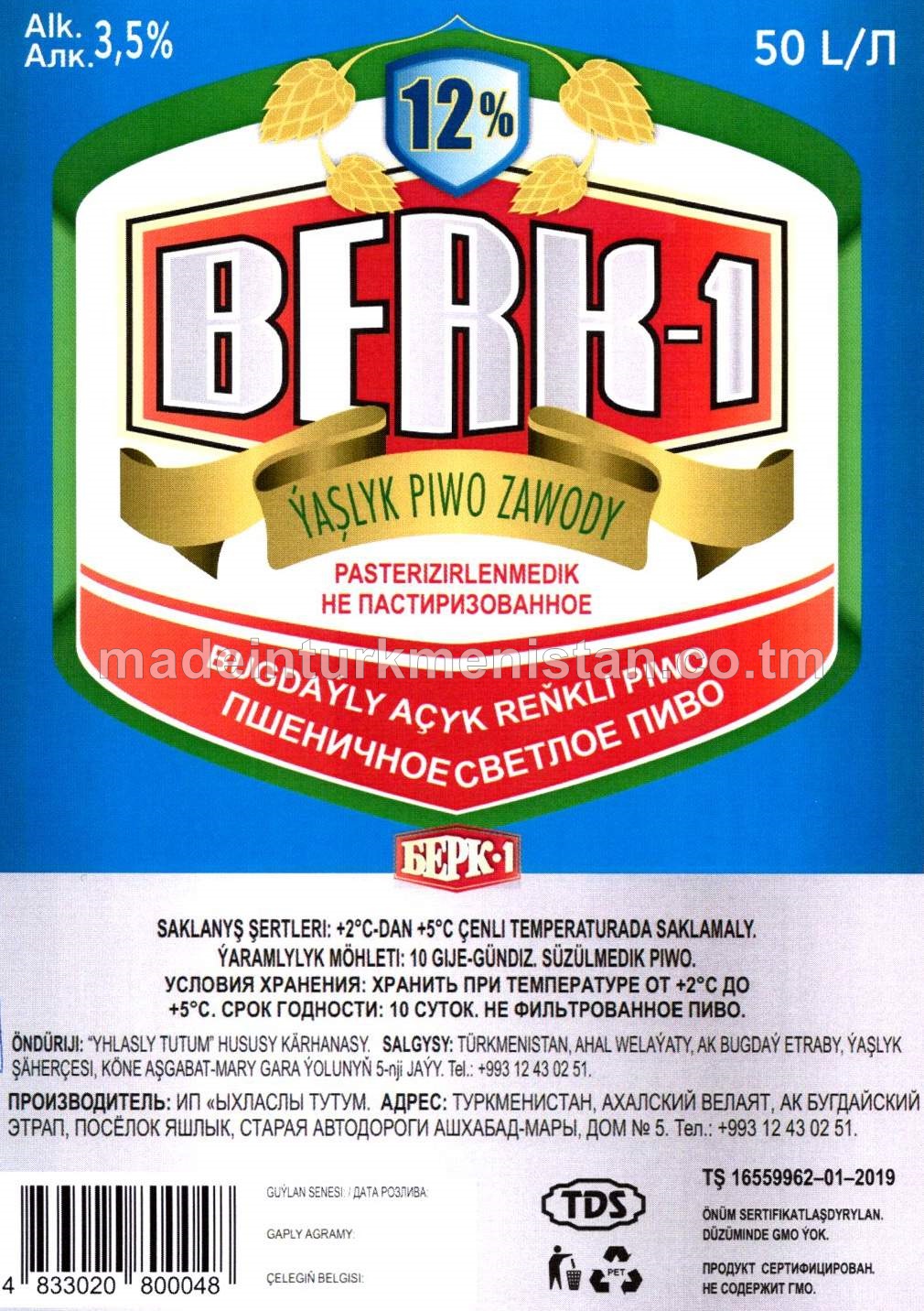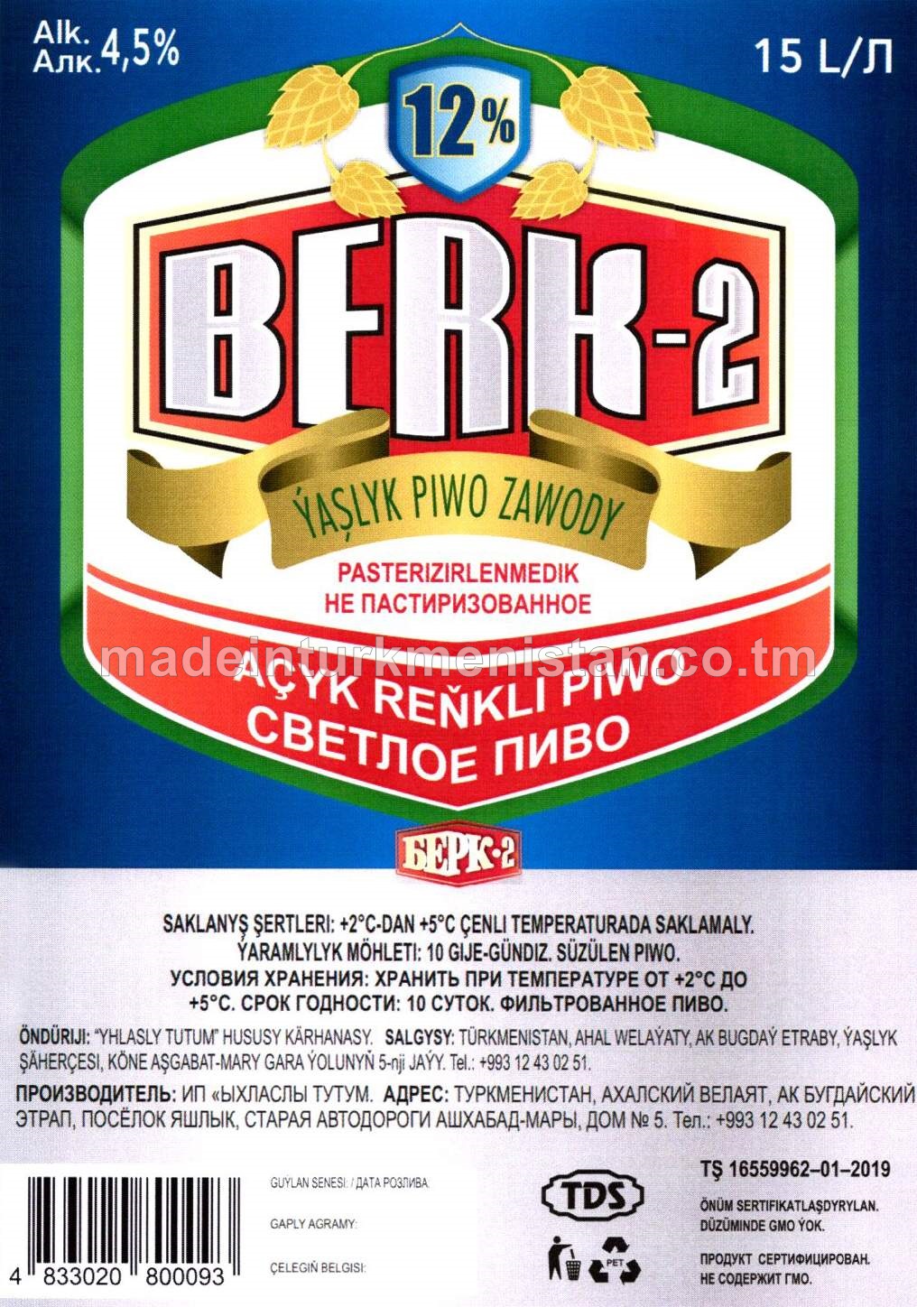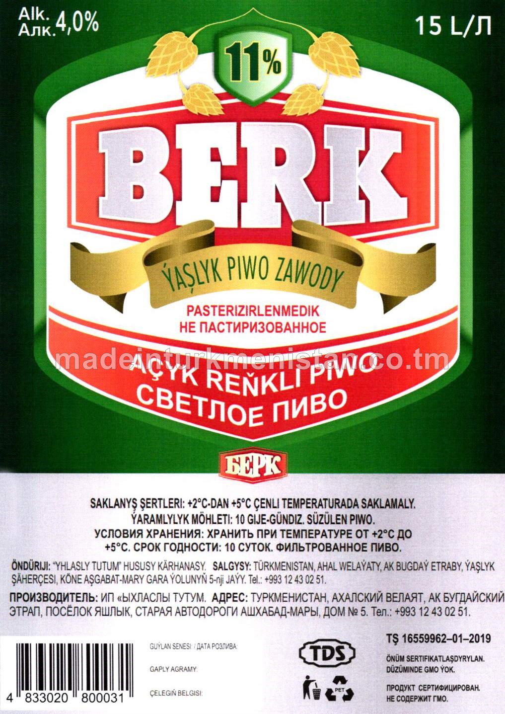 Açyk reňkli pasterizirlenen süzülen piwo. Alk: 4,5%