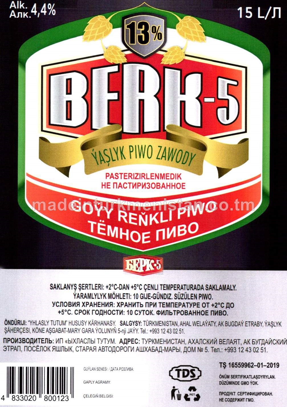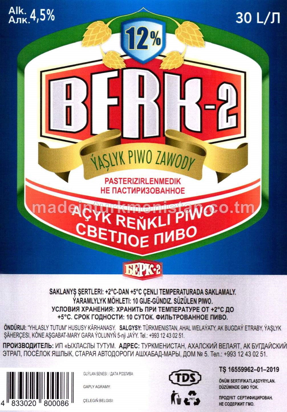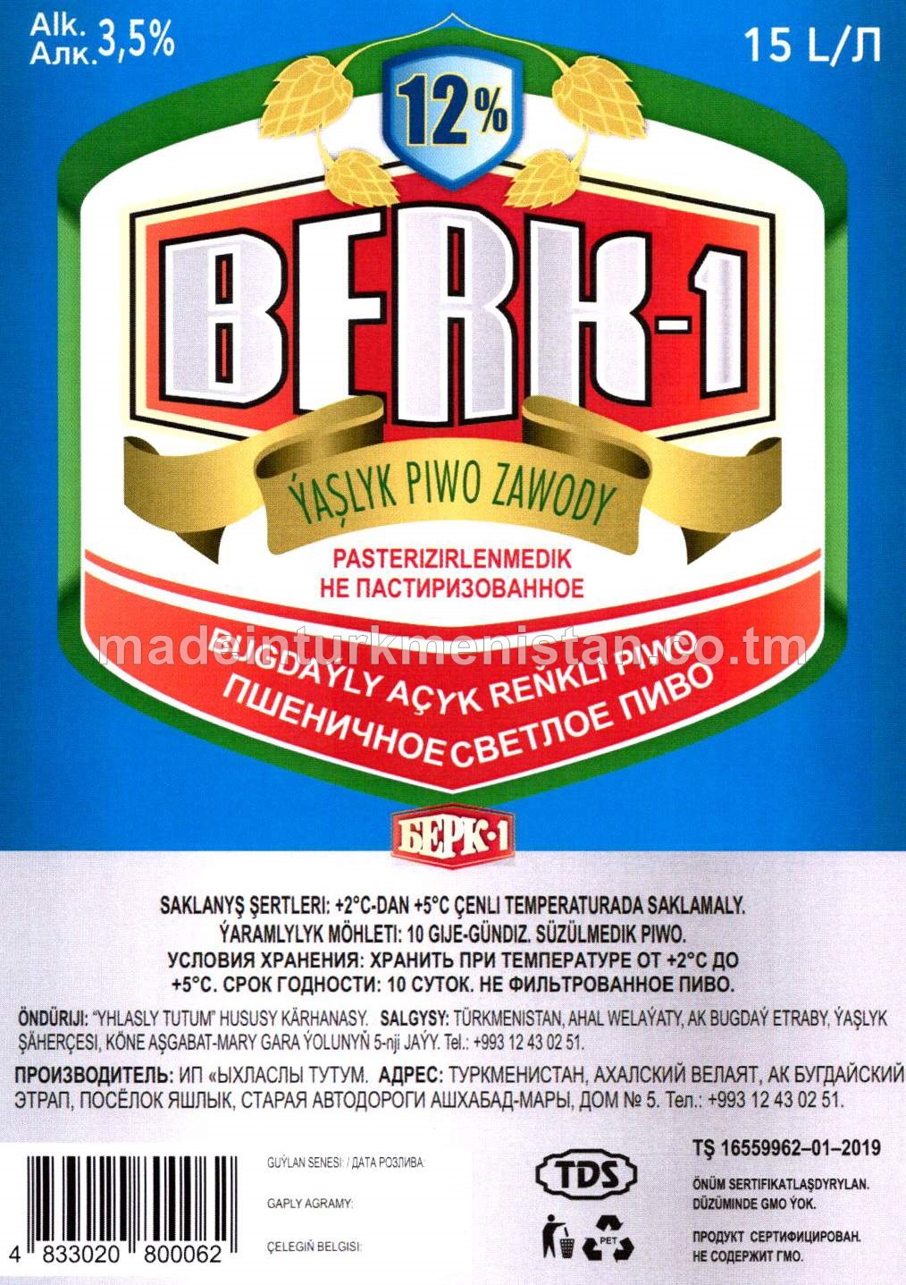 Açyk reňkli pasterizirlenen süzülen piwo. Alk: 4,5%
