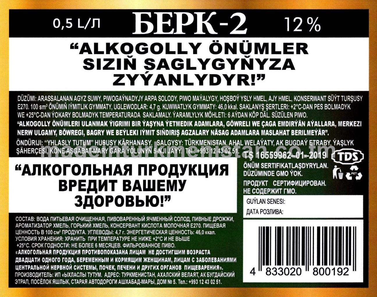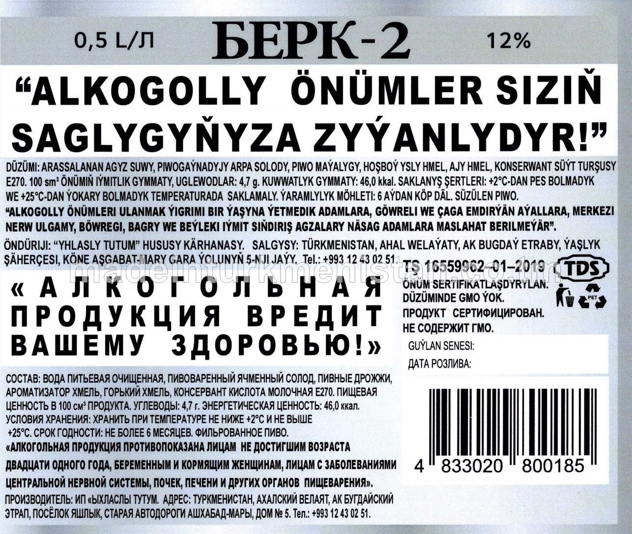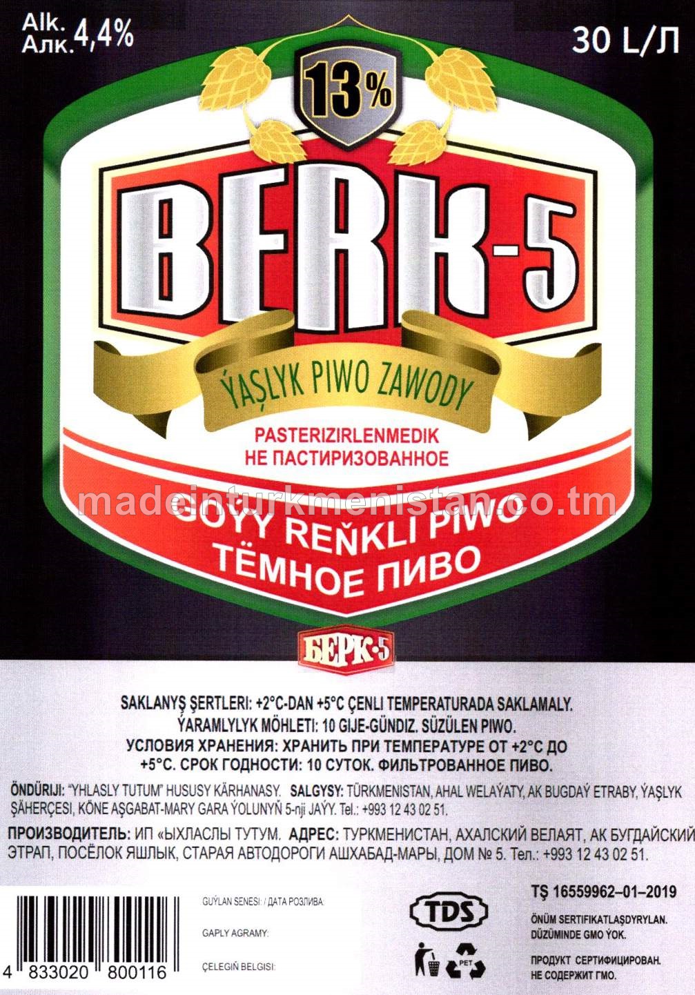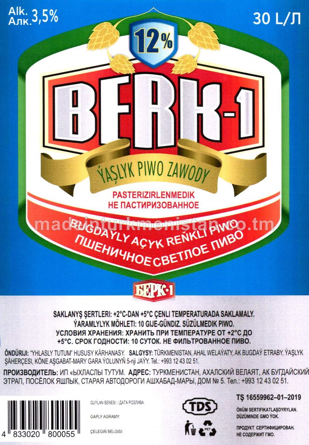 Açyk reňkli pasterizirlenen süzülen piwo. Alk: 4,5%