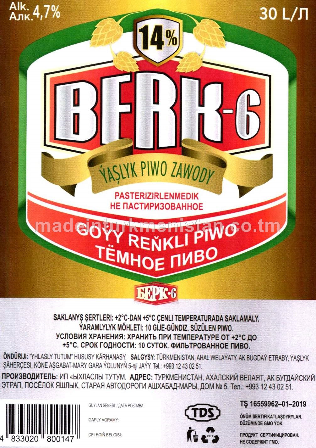 Pasterizirlenmedik goýy reňkli süzülen piwo, 14%. 4,7%