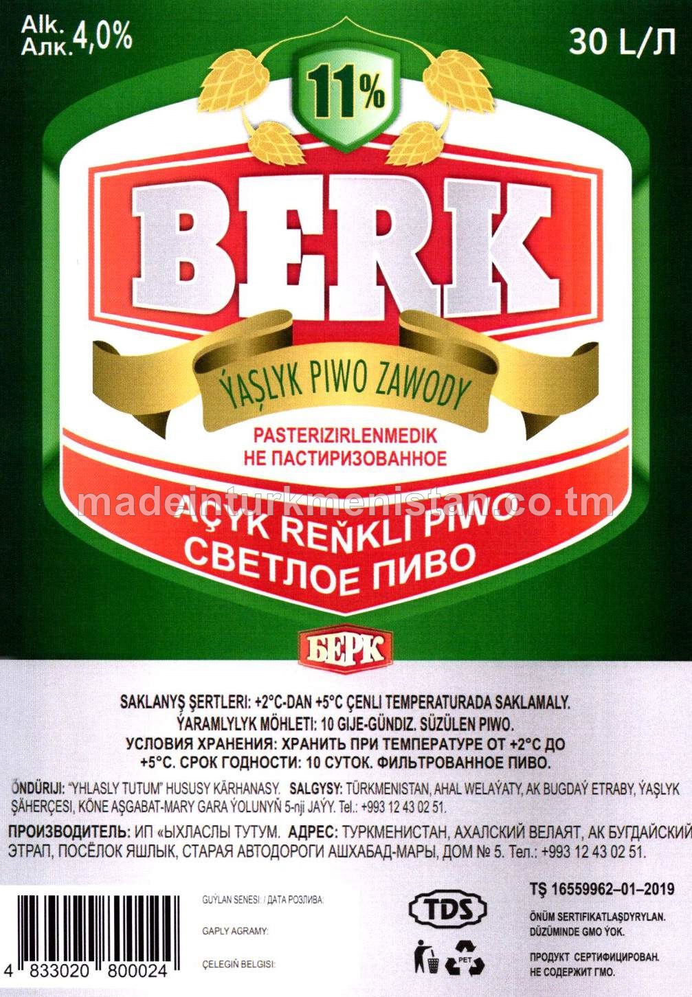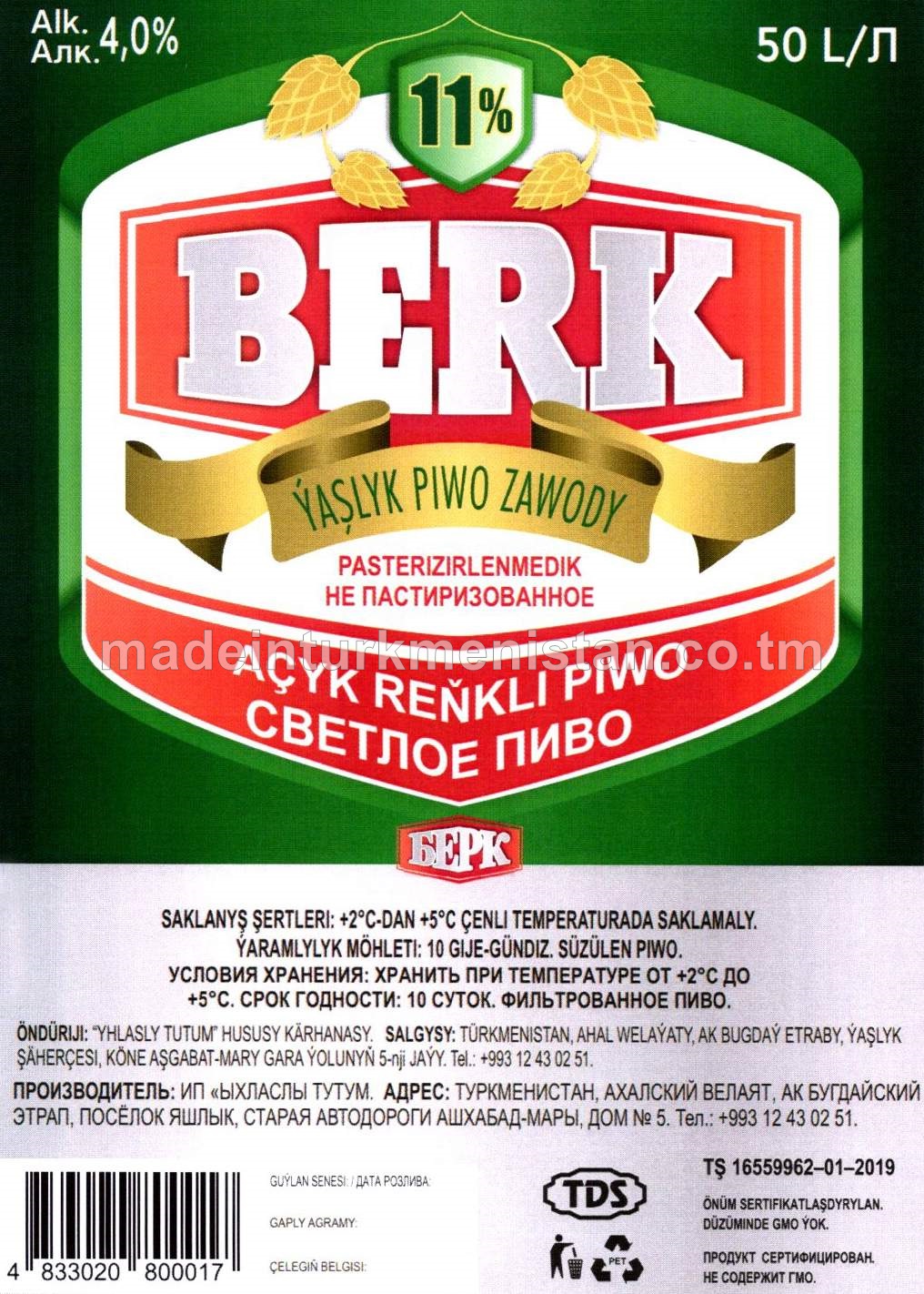 Açyk reňkli pasterizirlenen süzülen piwo. Alk: 4,0%