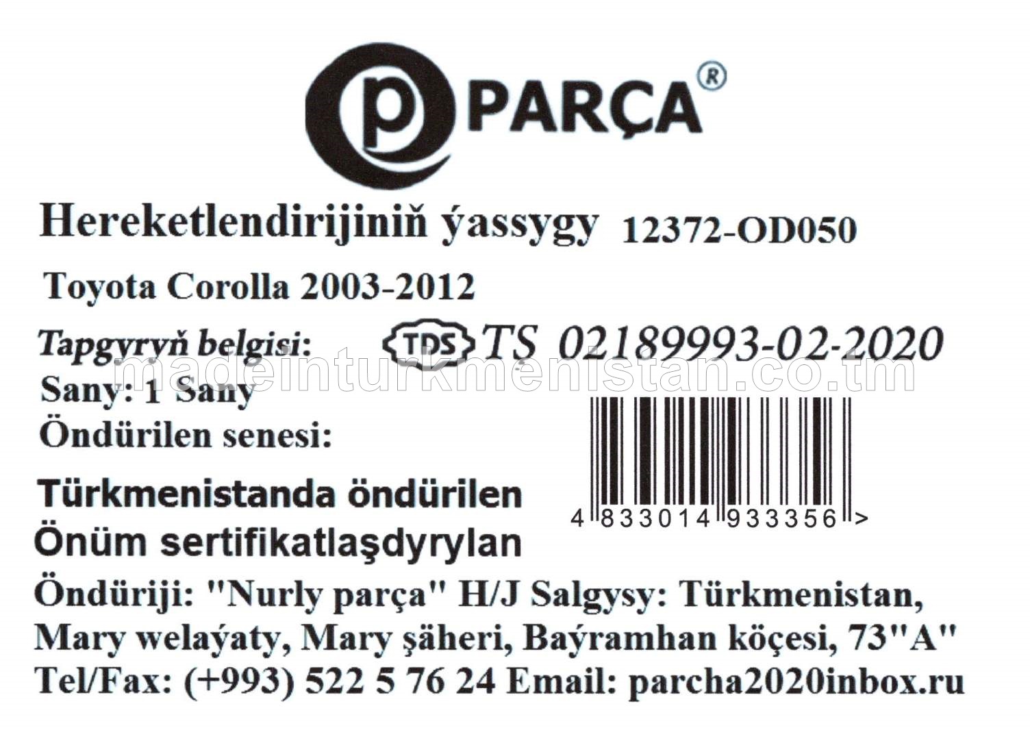 Hereketlendirijiniň ýassygy 12372-OD050 Toyota Corolla 2003-2012