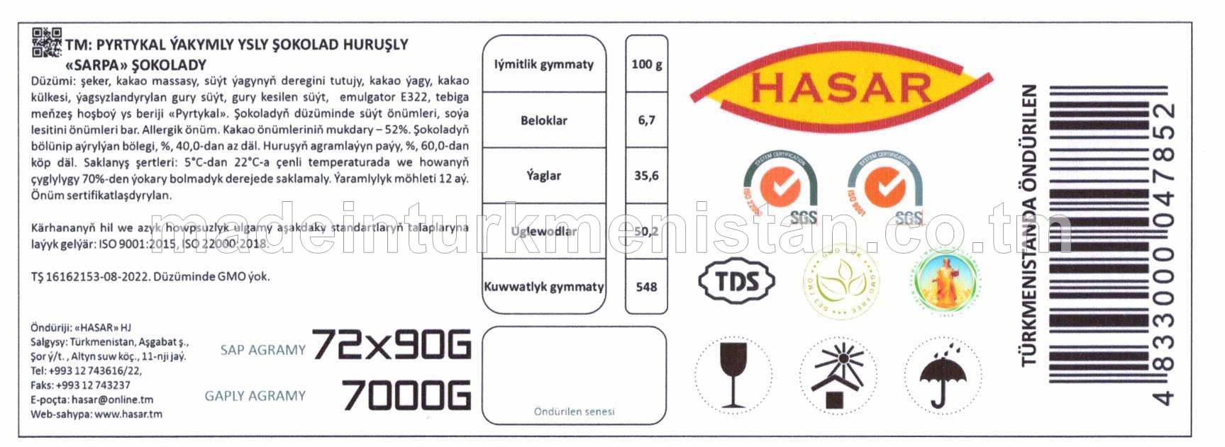 Pyrtykal ýakymly ysly şokolad huruşly "Sarpa" şokolady (72x90g)