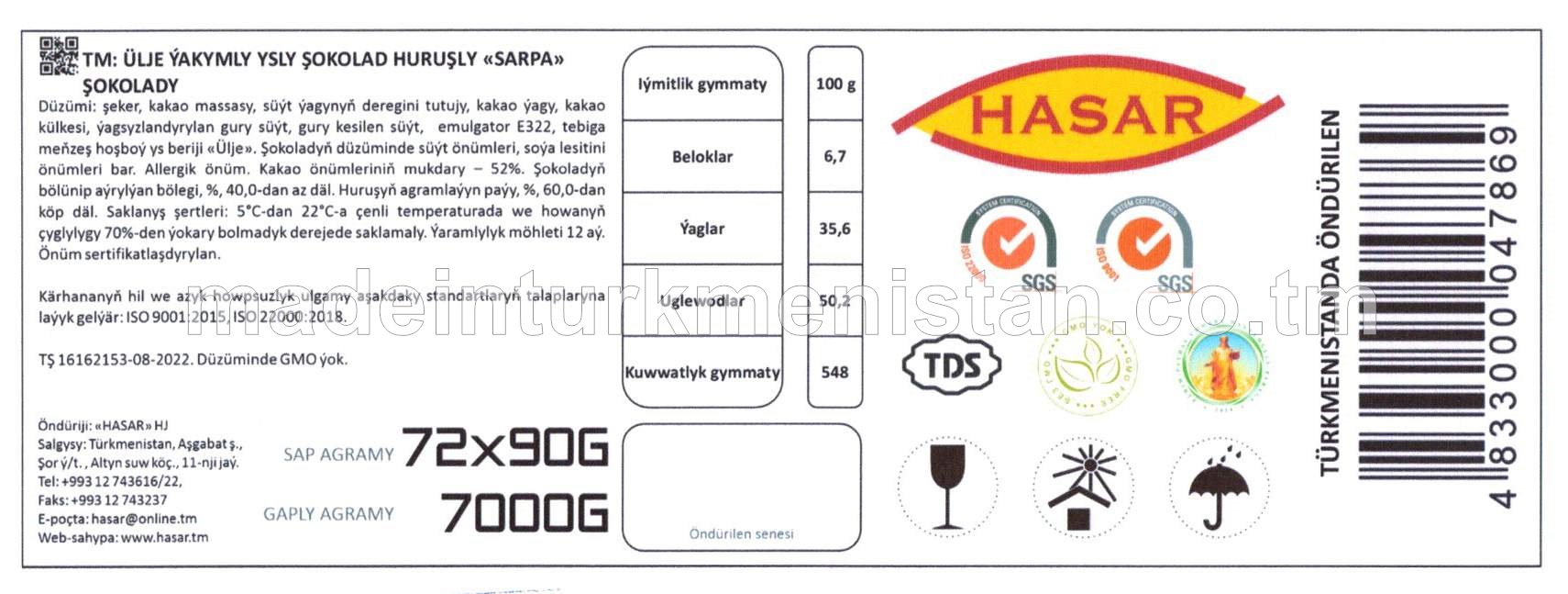 Ülje ýakymly ysly şokolad huruşly "Sarpa" şokolady (72x90g)