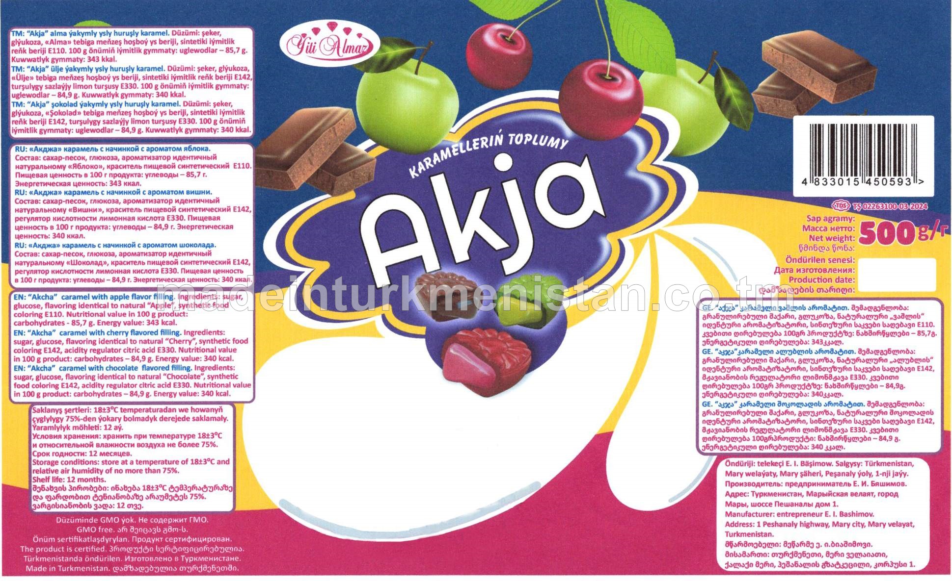 Akja (Alma, ülje, şokolad ýakymly ysly huruşly karamelleriň) karamelleriň toplumy