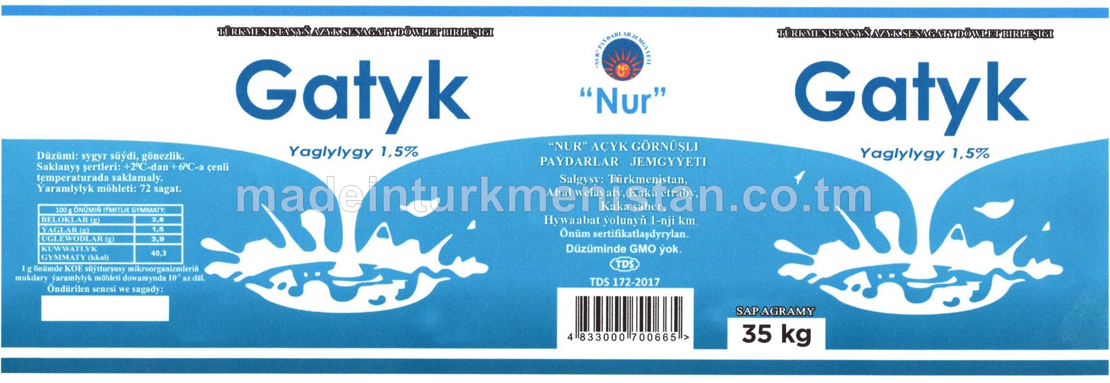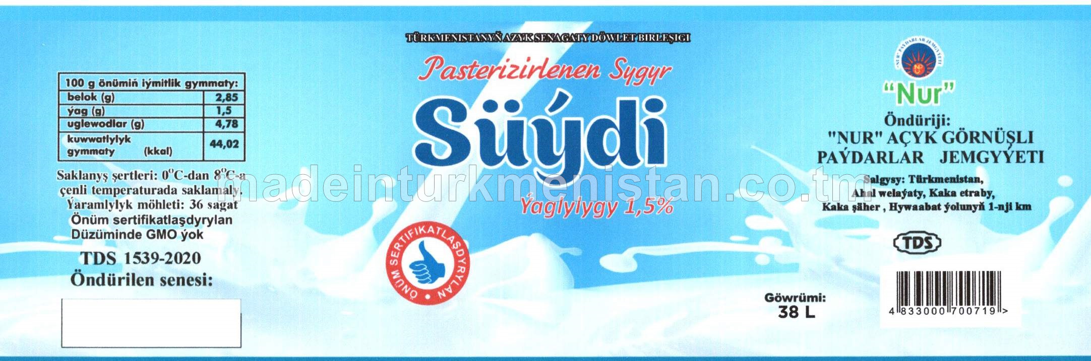 Pasterizirlenen sygyr süýdi. Ýaglylygy 1,5%