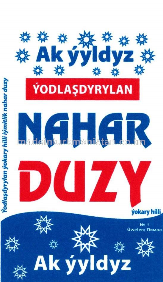 Ýodlaşdyrylan birinji hilli iýmitlik nahar duzy, üwelen №1 (Türkmenistanda öndürilen)