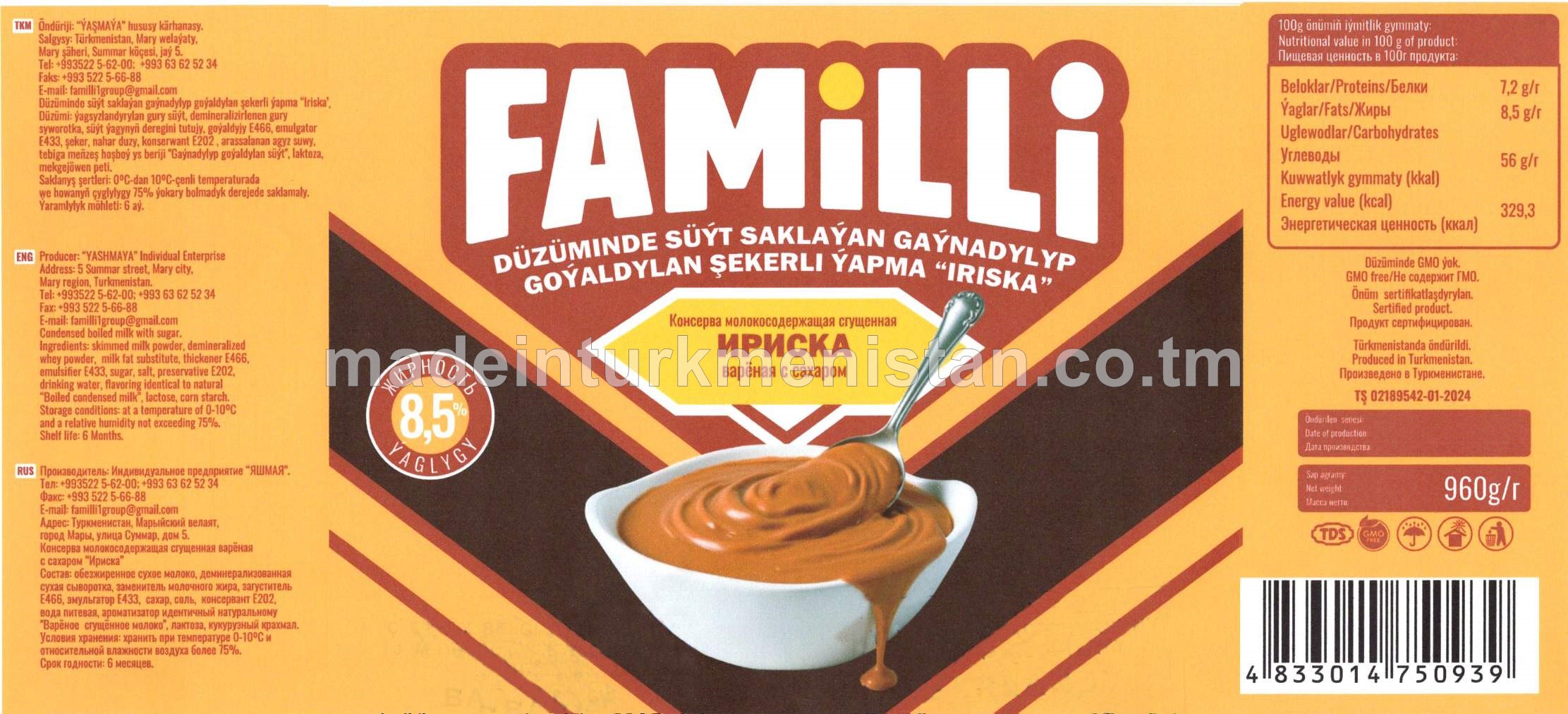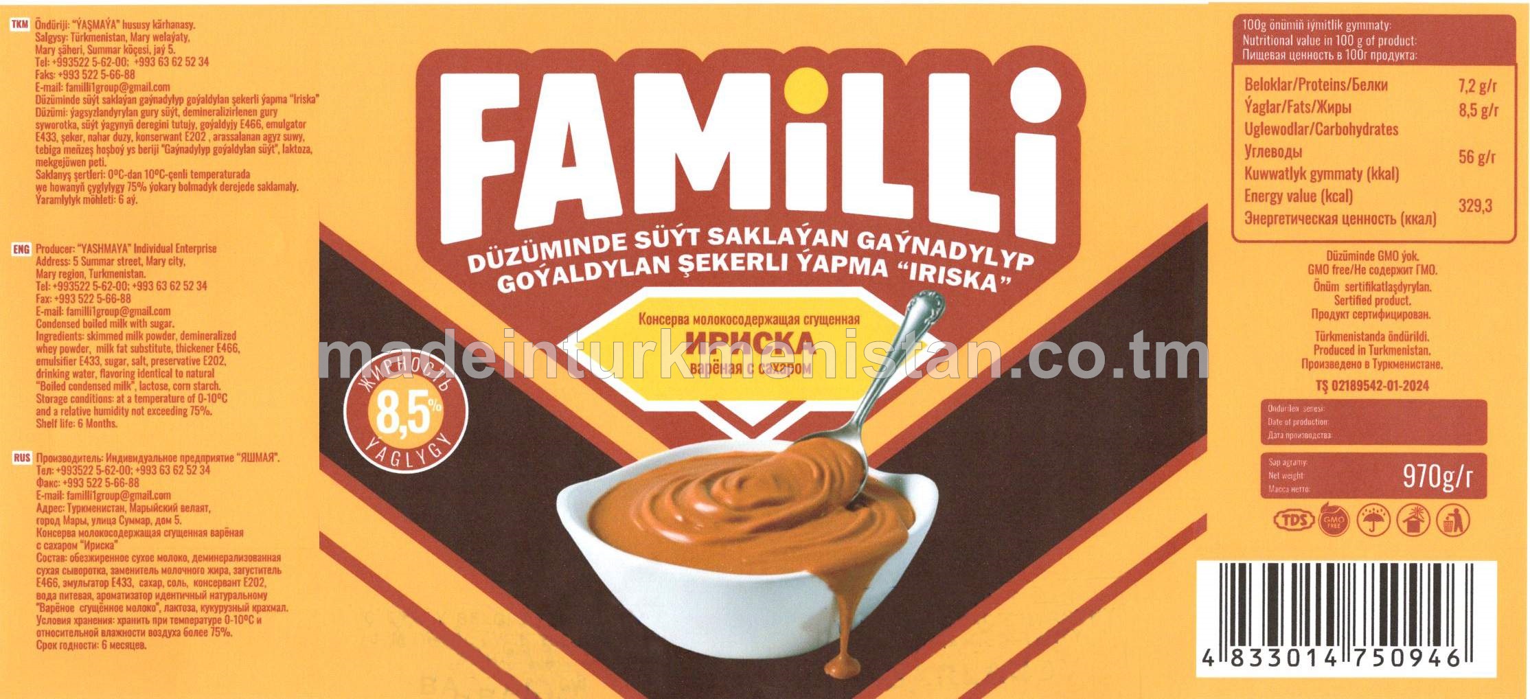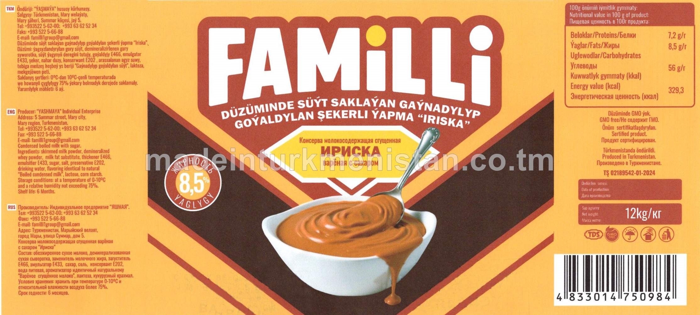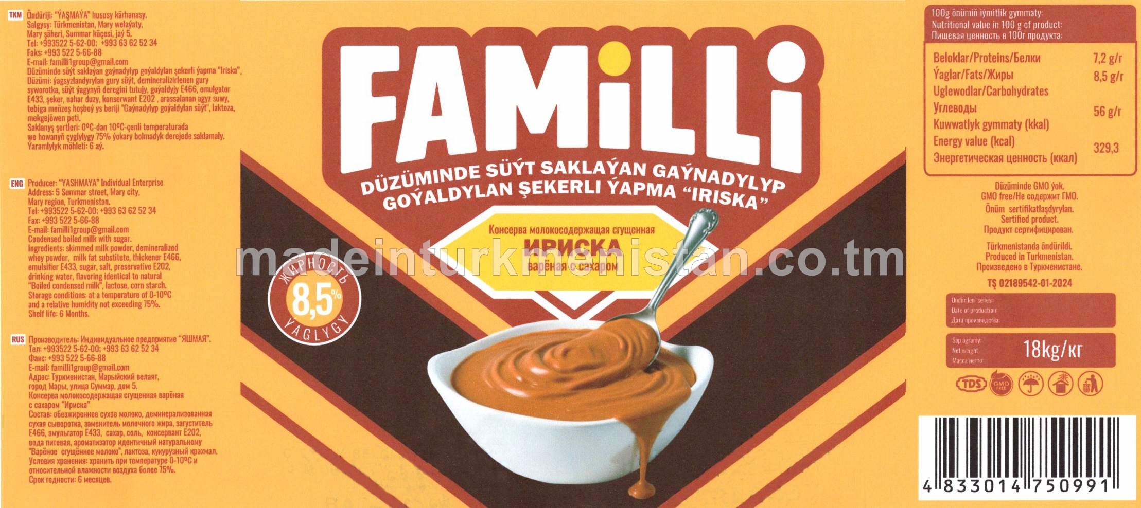 Düzüminde süýt saklaýan gaýnadylyp goýaldylan şekerli ýapma "iriska". Ýaglylygy 8,5%