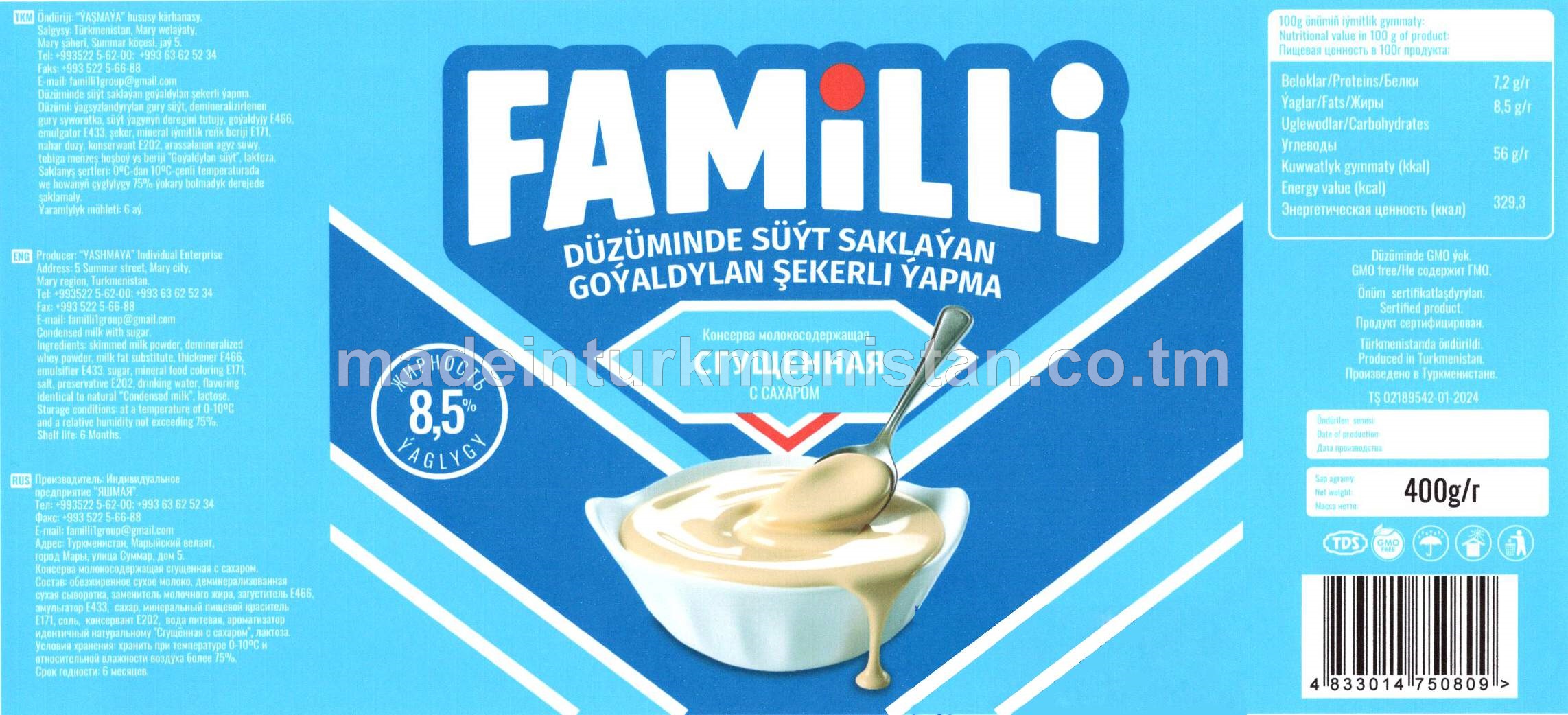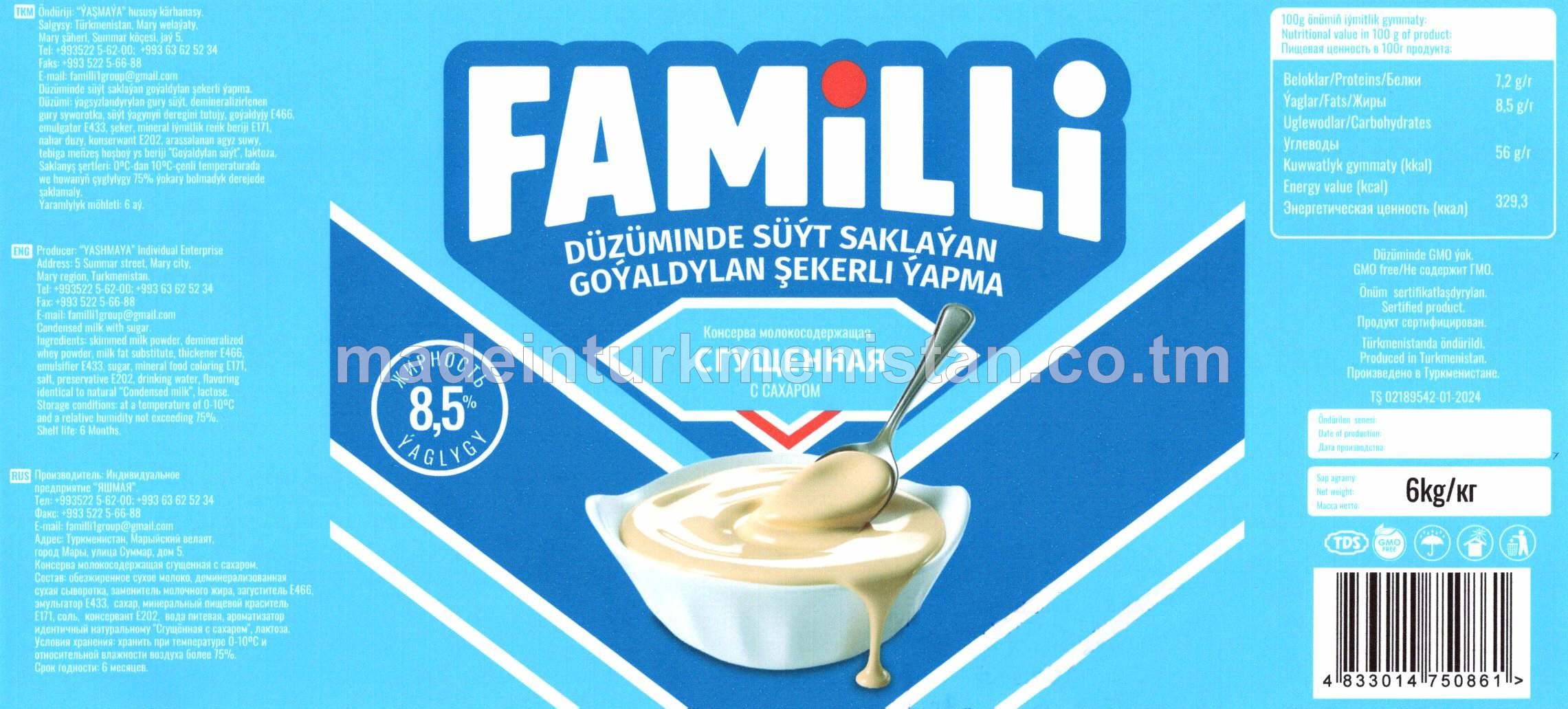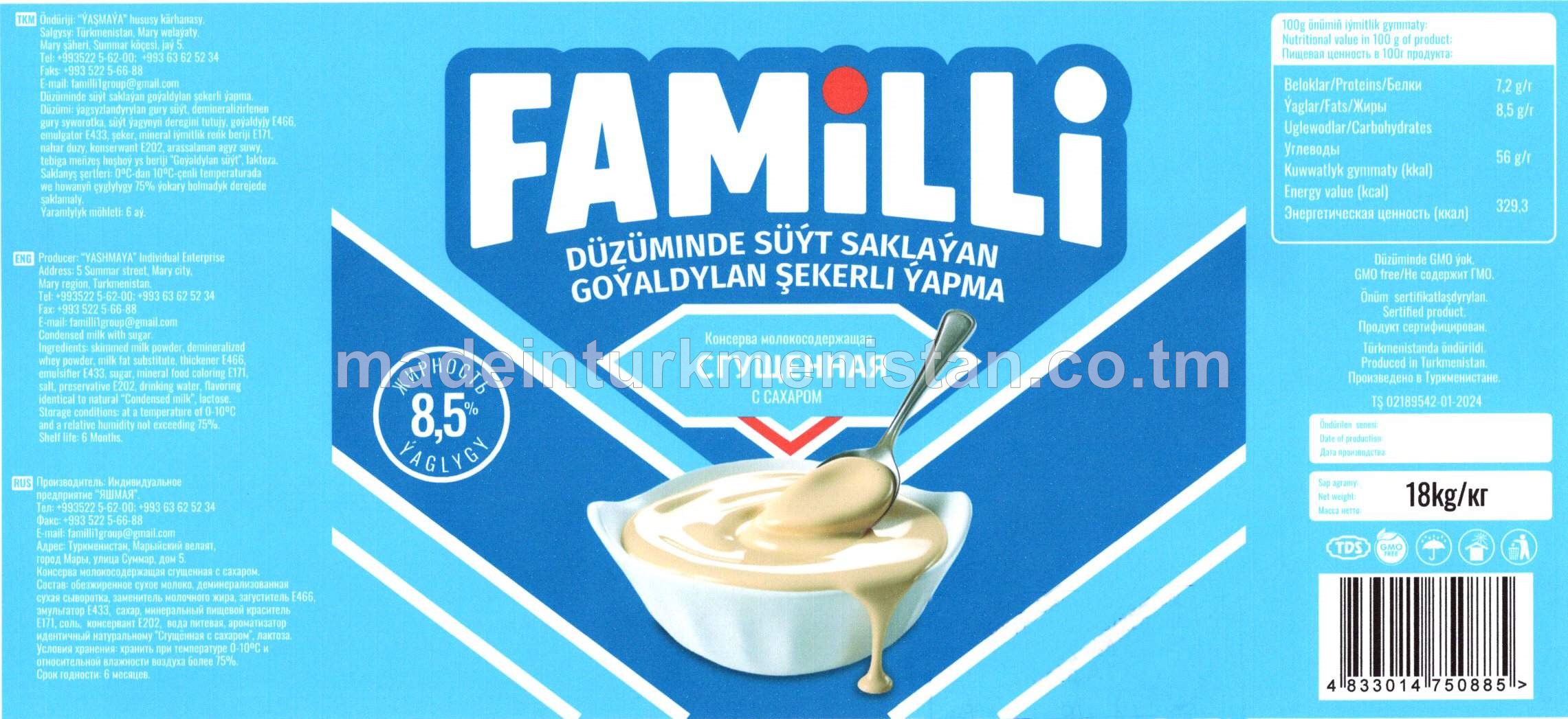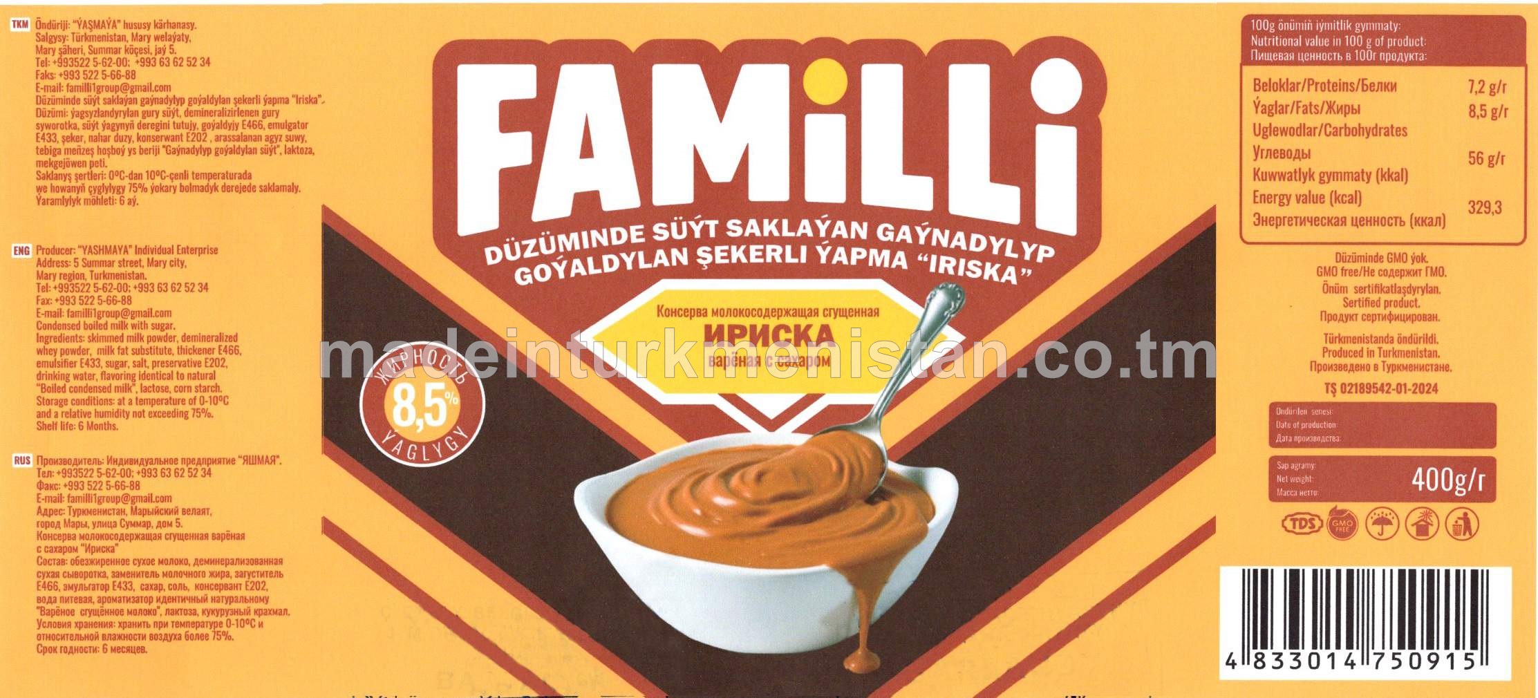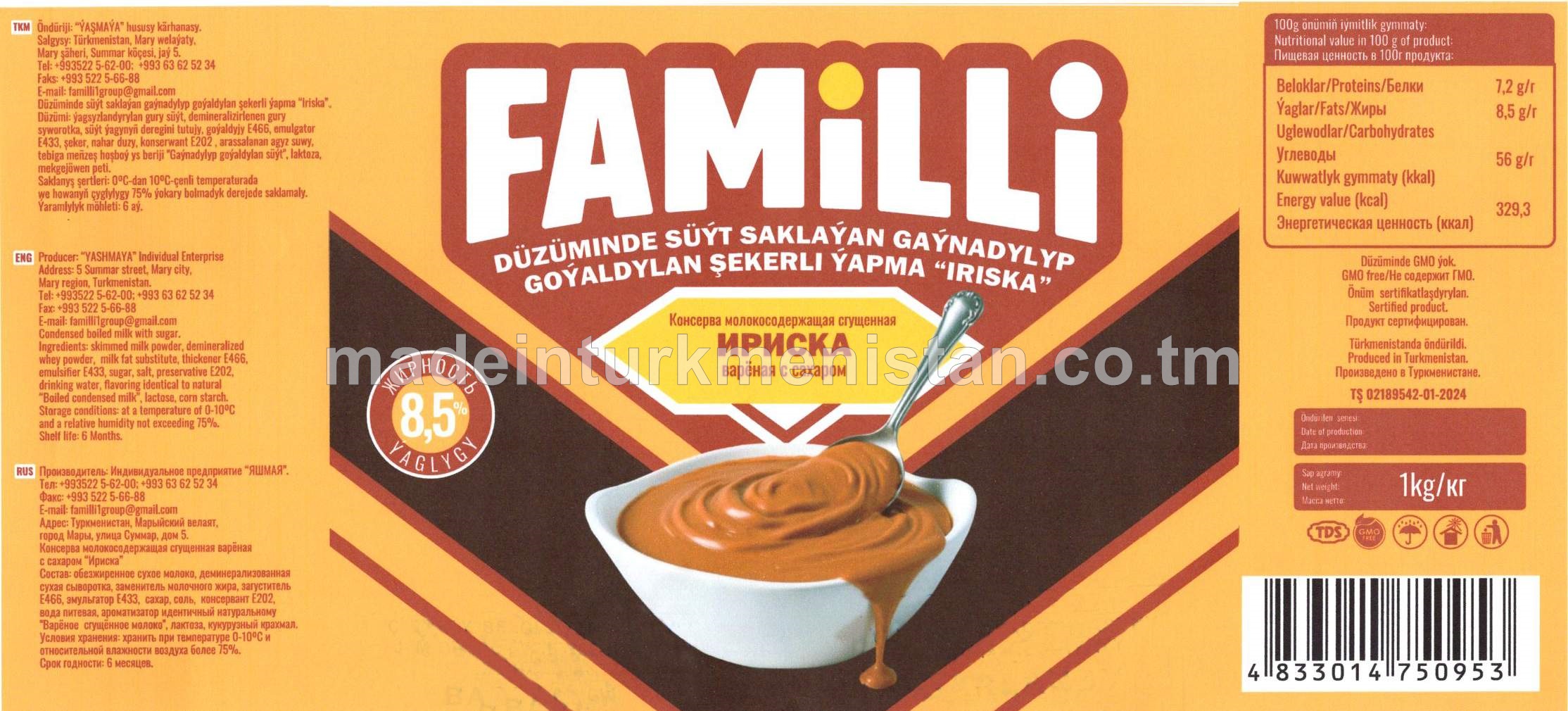 Düzüminde süýt saklaýan gaýnadylyp goýaldylan şekerli ýapma "iriska". Ýaglylygy 8,5%