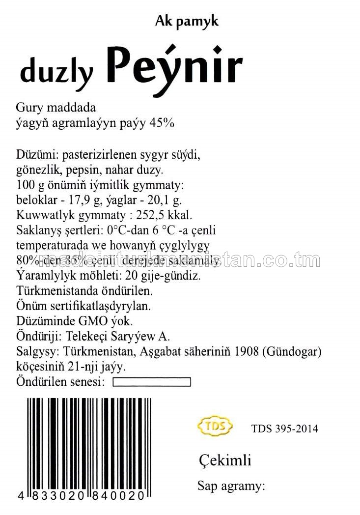 Duzly peynir, ýaglylygy 45% (çekimli)