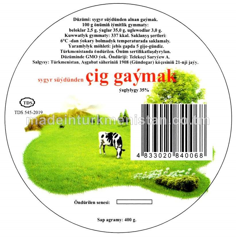 Sygyr süýdünden çig gaýmak. Ýaglylygy 35%